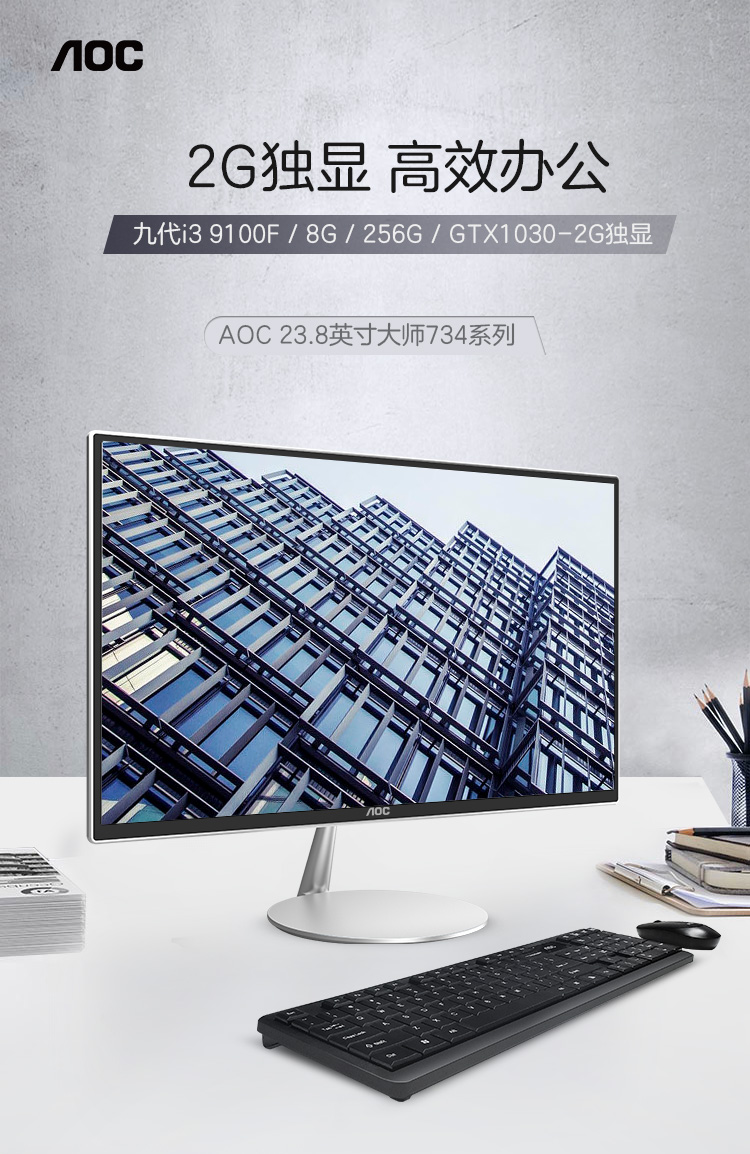 - 商品名称:AOC AIO大师734 23.8英寸高清办公游戏一体机台式电脑 (九代i3 9100F 8G 256GSSD 2G独显 无线WiFi 送键鼠)
