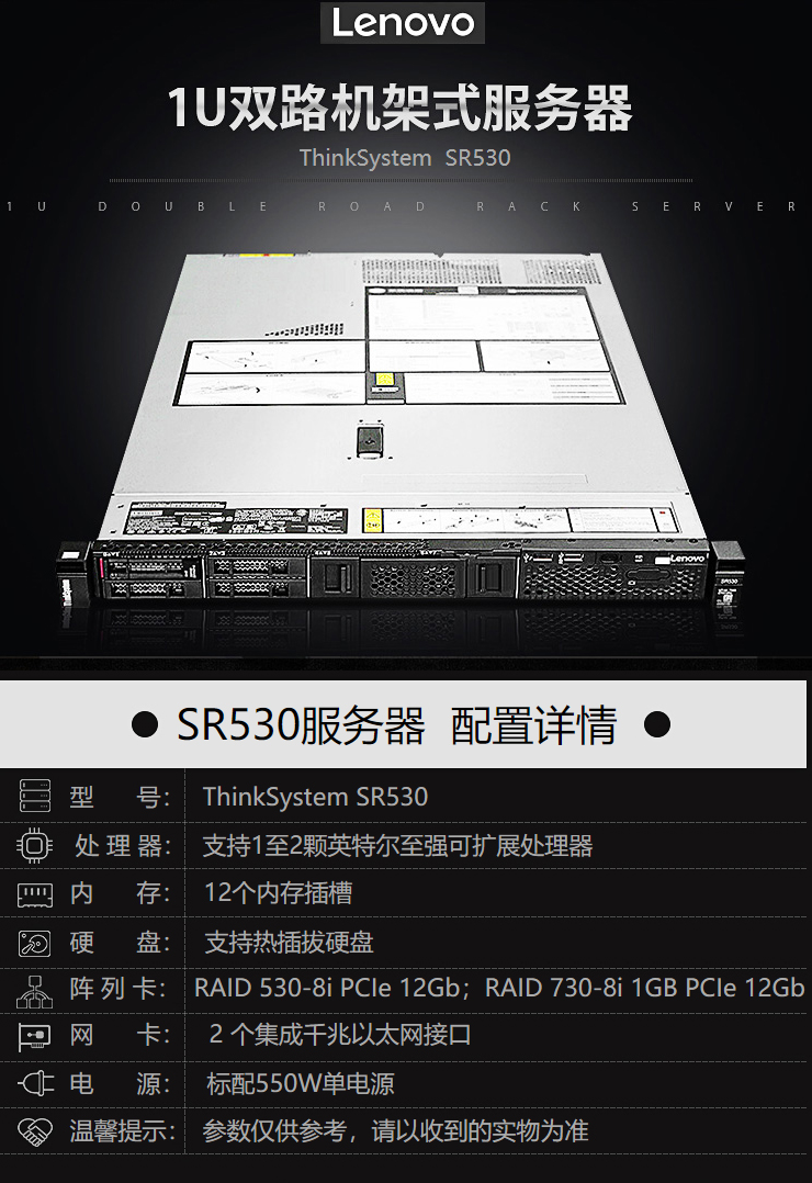 联想(Lenovo)ThinkSystem SR530 1U机架式服务器主机 1颗铜牌32068C 1.9G 16G内存2 x 600GR730
