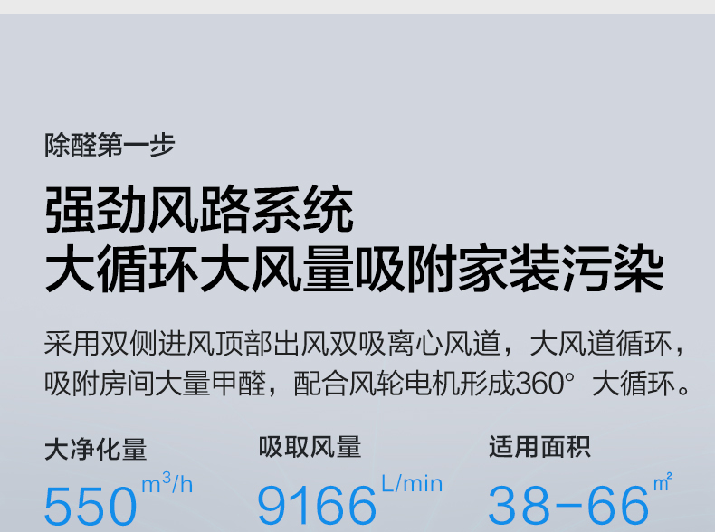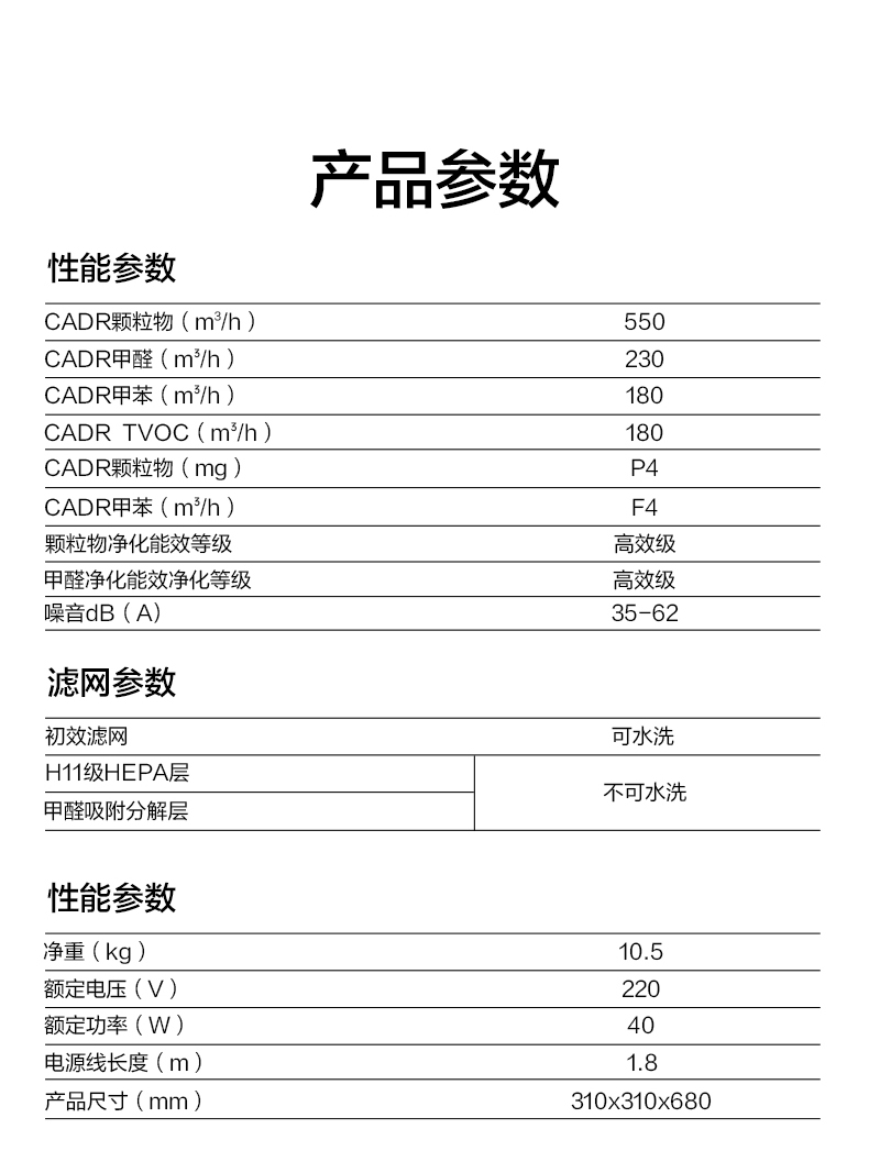 - 固态污染物CADR(立方米/小时):550立方米/小时