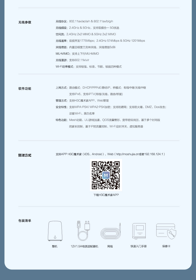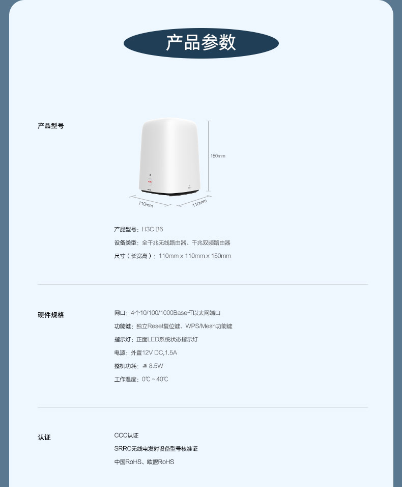 - 商品名称:华三(H3C)B6 WiFi6 双核路由器无线家用穿墙智能分频双千兆高速路由游戏加速