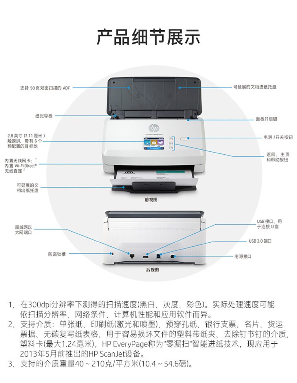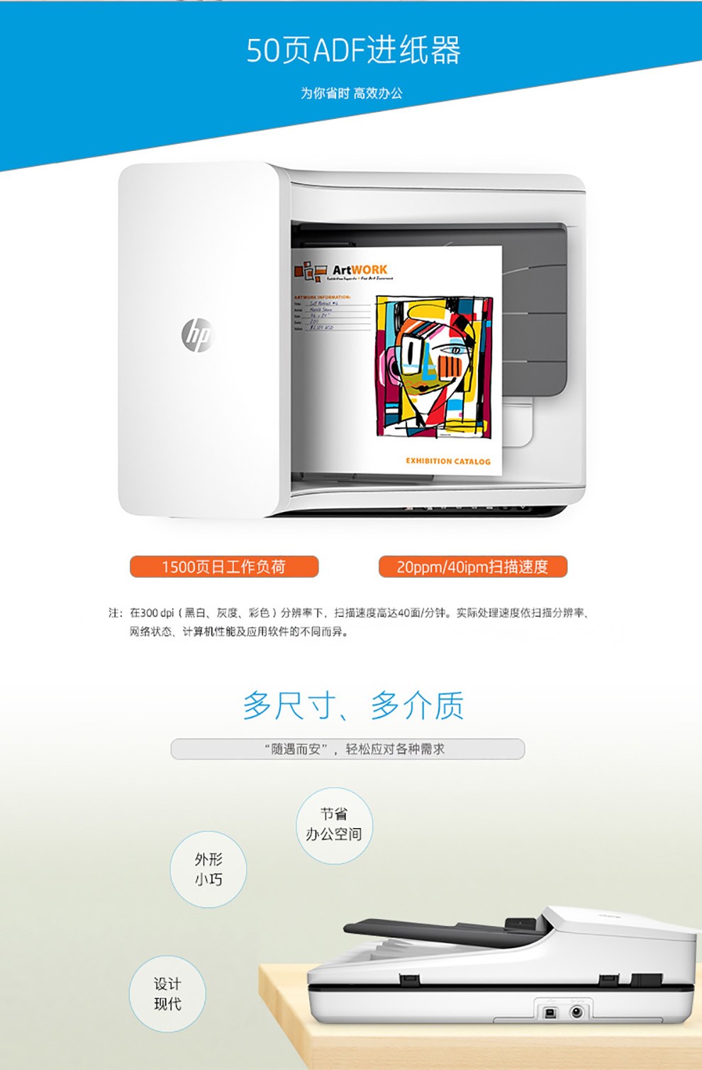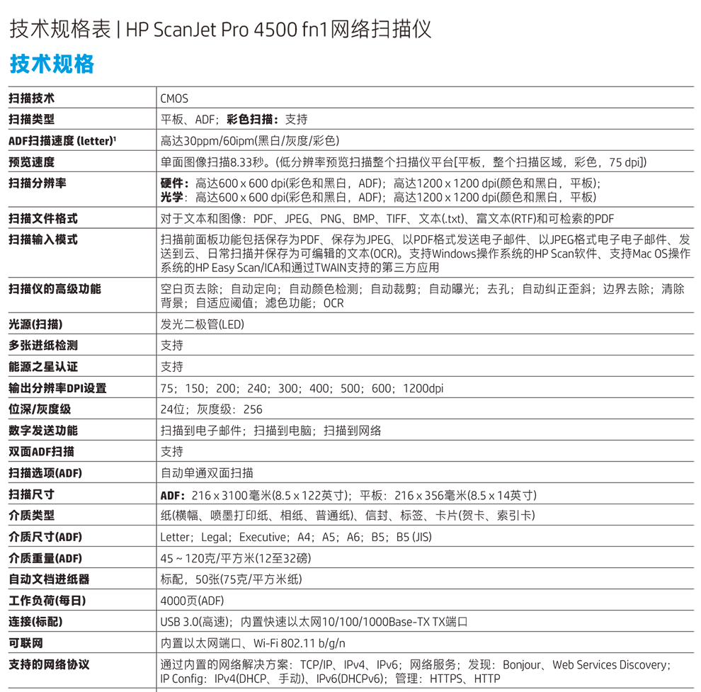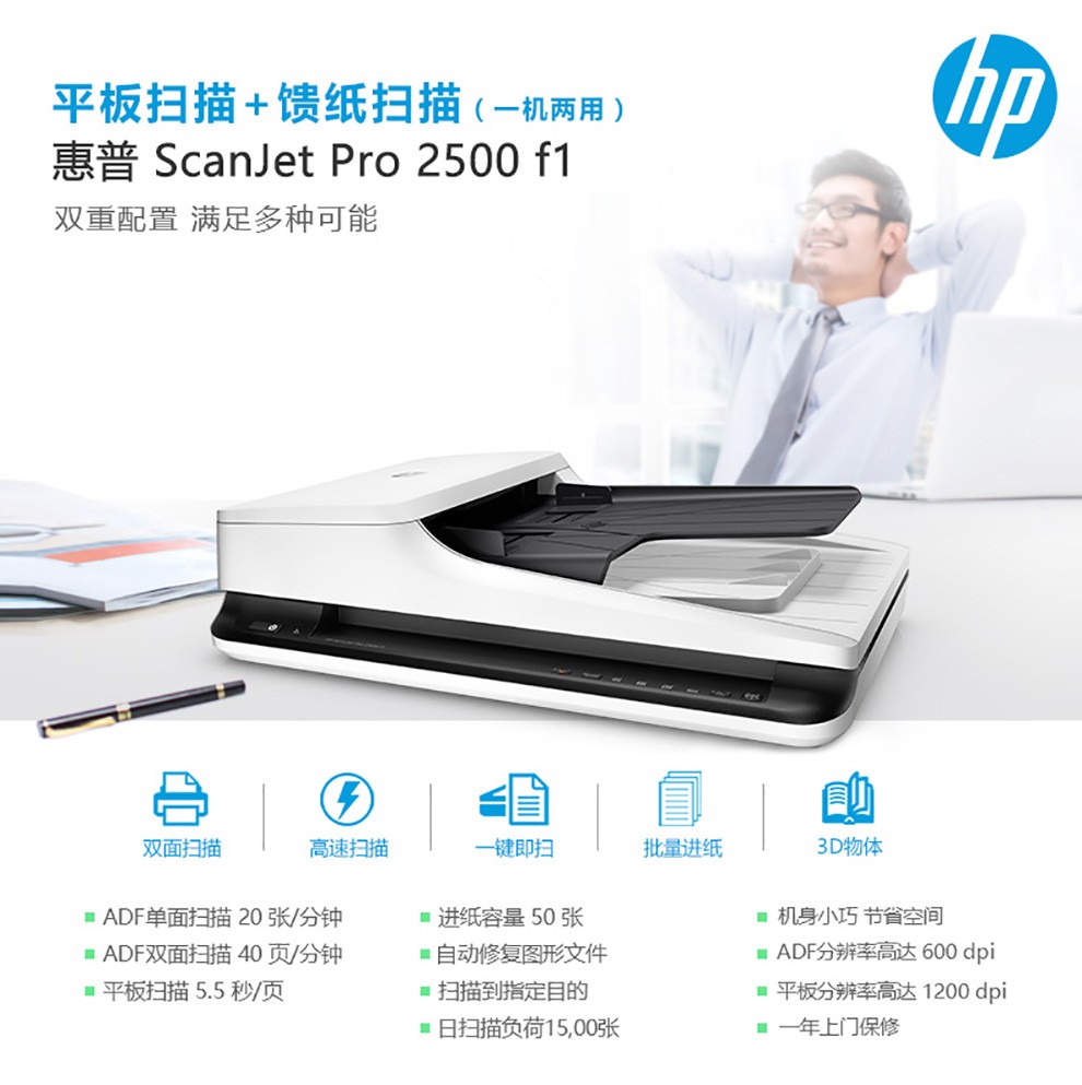 - 商品名称:惠普hp2500f1 4000snw1 4500fn1扫描仪高速连续 平板馈纸自动双面进纸 办公文档 SJ2500f1【20页/40面每分钟】