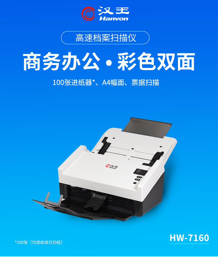 - 商品名称:汉王(Hanvon)HW-7160馈纸式高速档案扫描仪A4幅面CCD商用办公文件文档60ppm/120ipm
