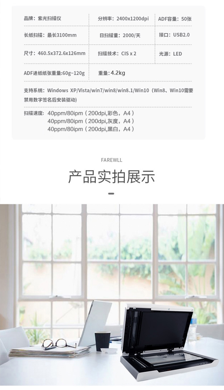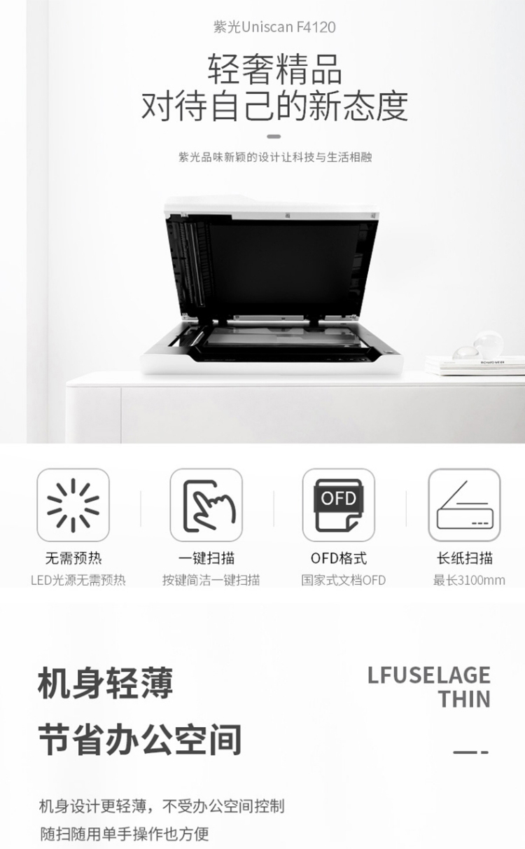 - 商品名称:紫光(UNIS)Uniscan F4120 A4幅面高清高速办公文档 馈纸+平板 双平台扫描仪 40页80面每分钟