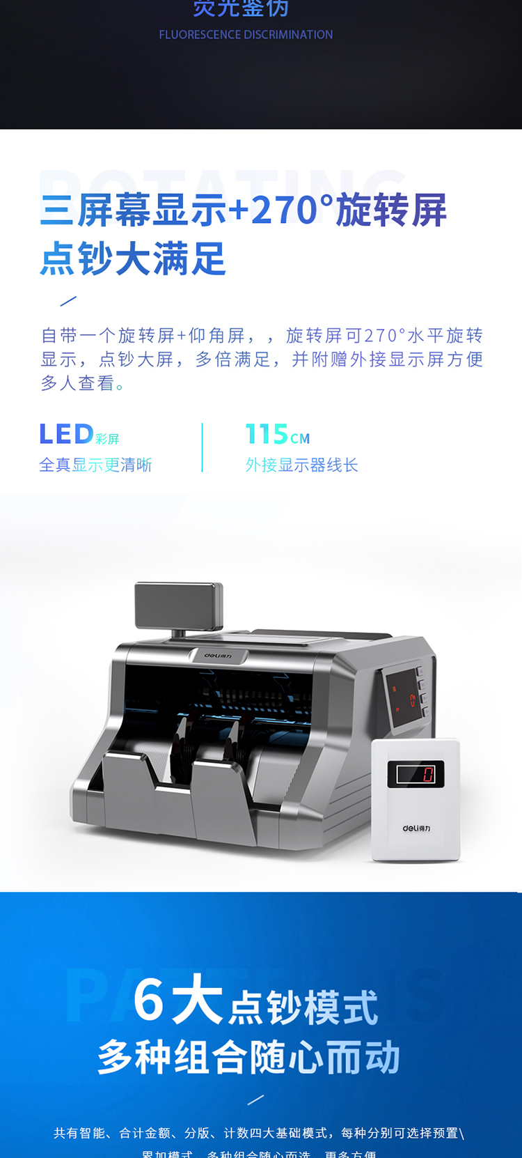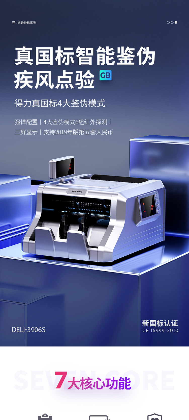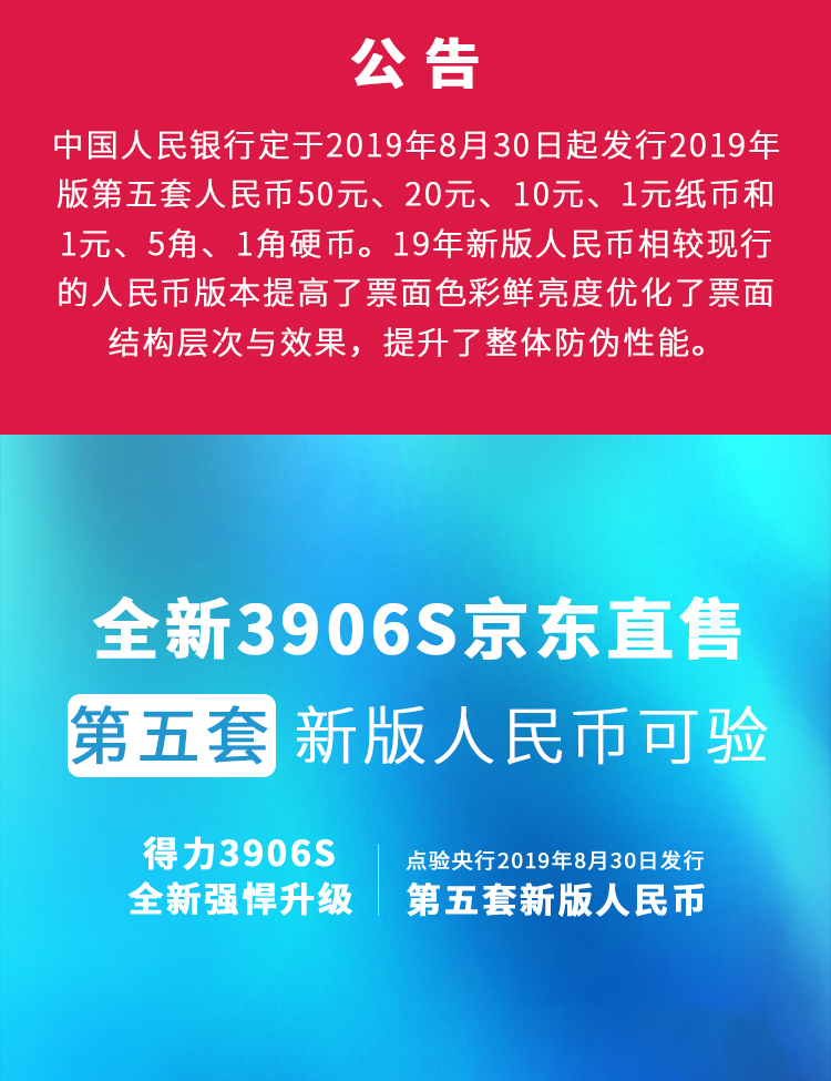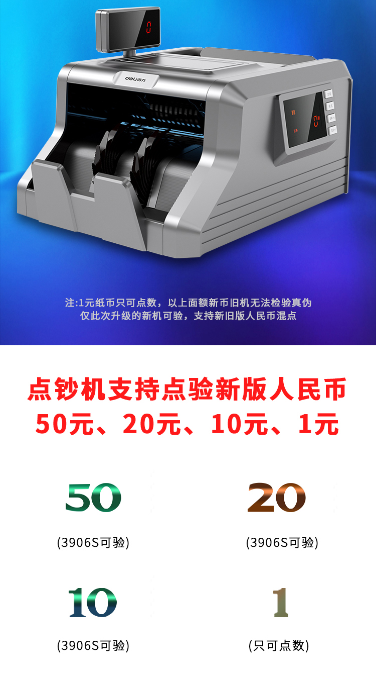 商品名称:得力(deli)2019新版智能双屏银行专用人民币点钞机验钞机 商用家用收银支付点钞机数钱机数钞机3906S