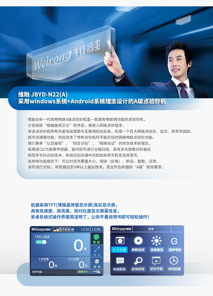 - 商品名称:维融(weirong)N22(A)点钞机2020年新版人民币银行专用高端A类全智能验钞机 网络升级