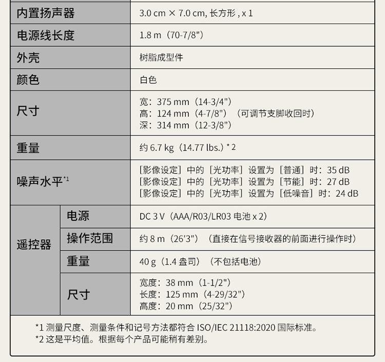- 噪音(dB):35dB(普通模式),27dB(节能模式),24 dB(低噪音模式)