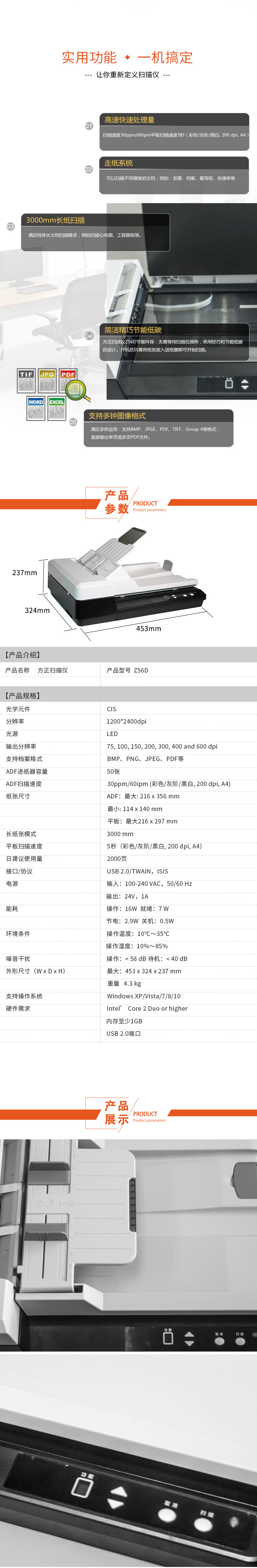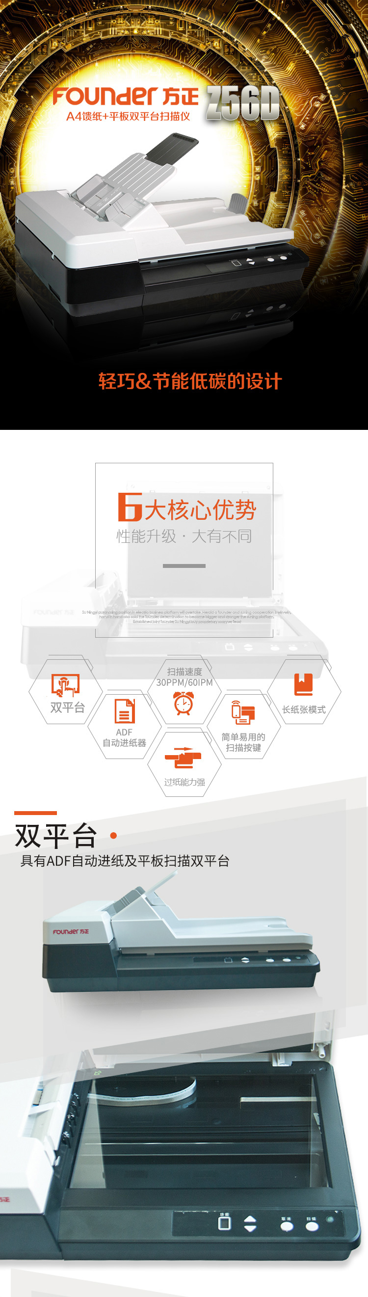 - 商品名称:方正(Founder)Z56D A4彩色高速双面自动进纸文档照片扫描仪