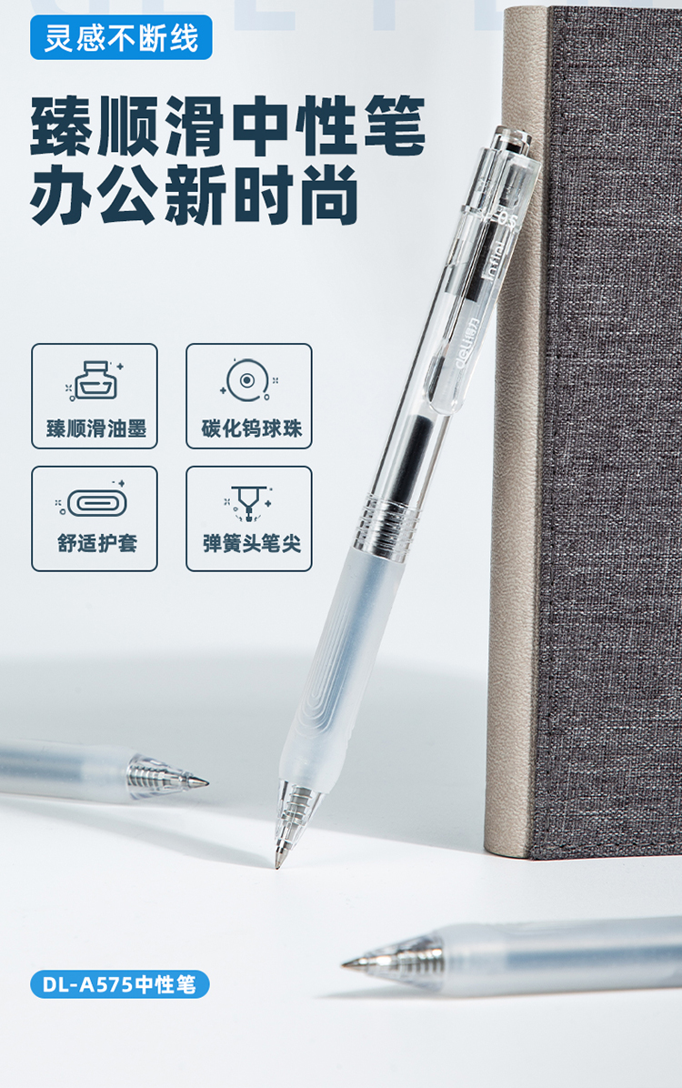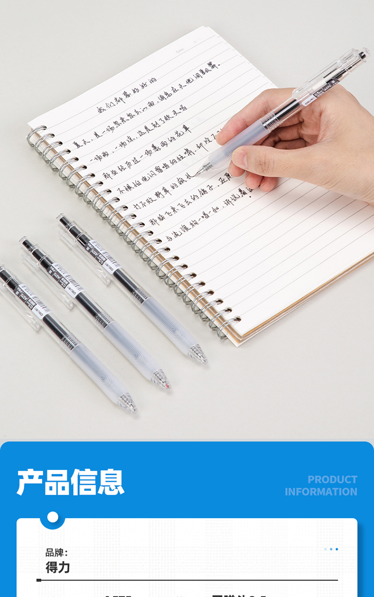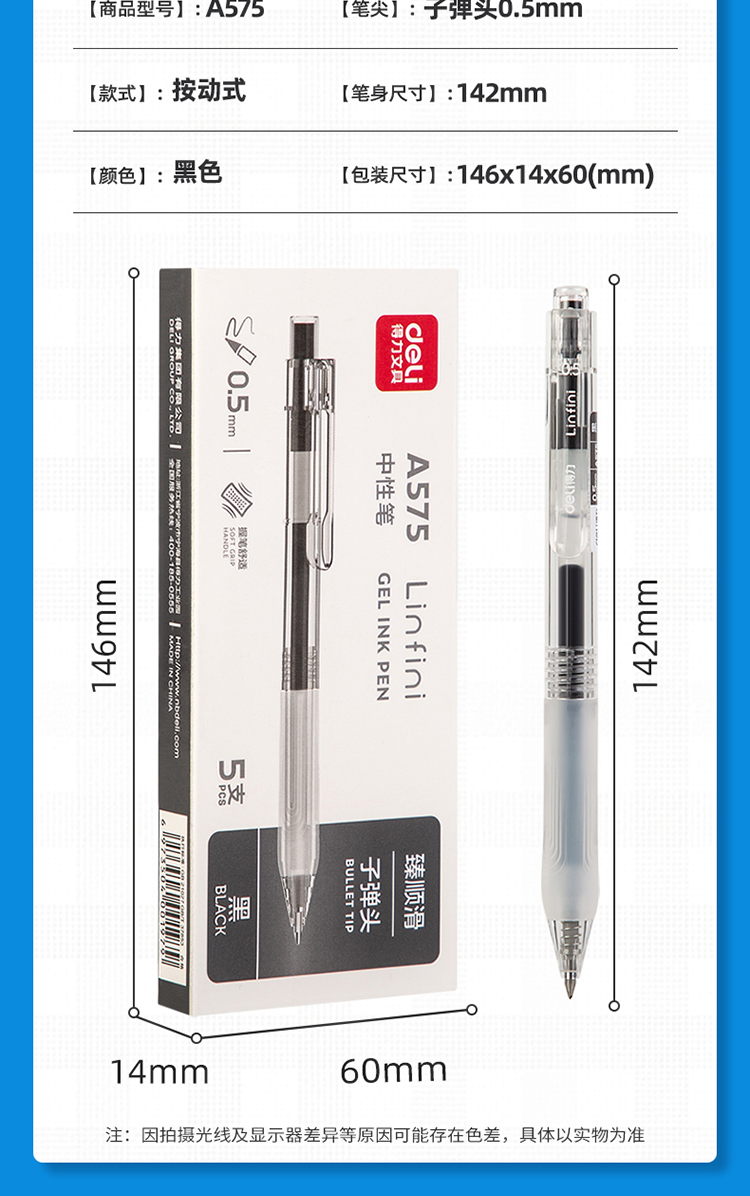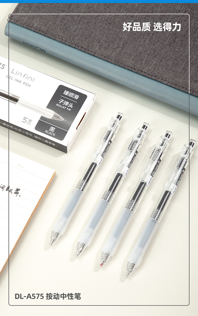 商品名称:得力(deli)DL-A575 臻顺滑按动中性笔无印风签字笔 学生办公笔 ins冷淡风 0.5mm子弹头 5支/盒