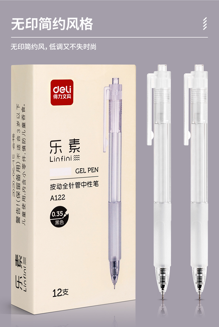 商品名称:得力(deli)DL-A122 按动中性笔 学生签字笔 简约无印风 0.35mm全针管12支/盒