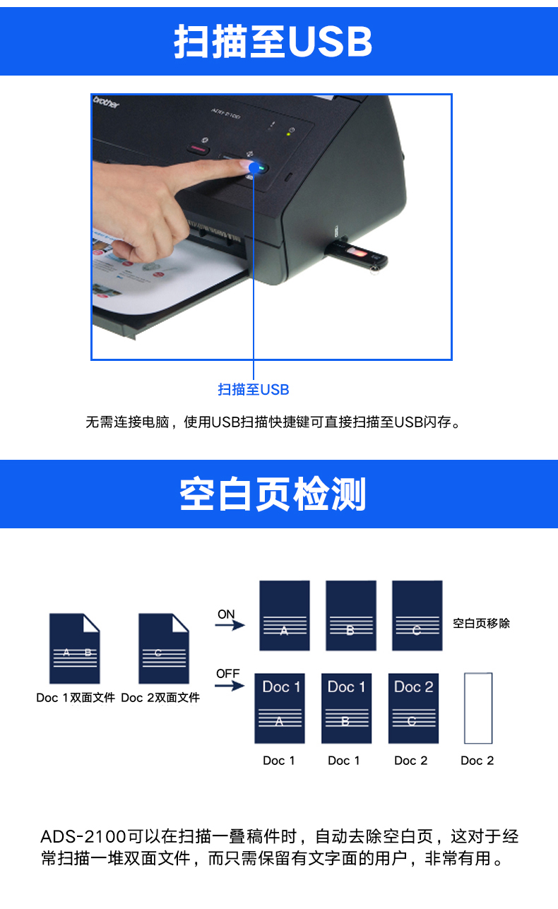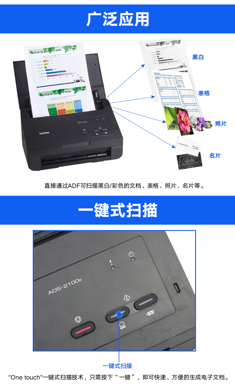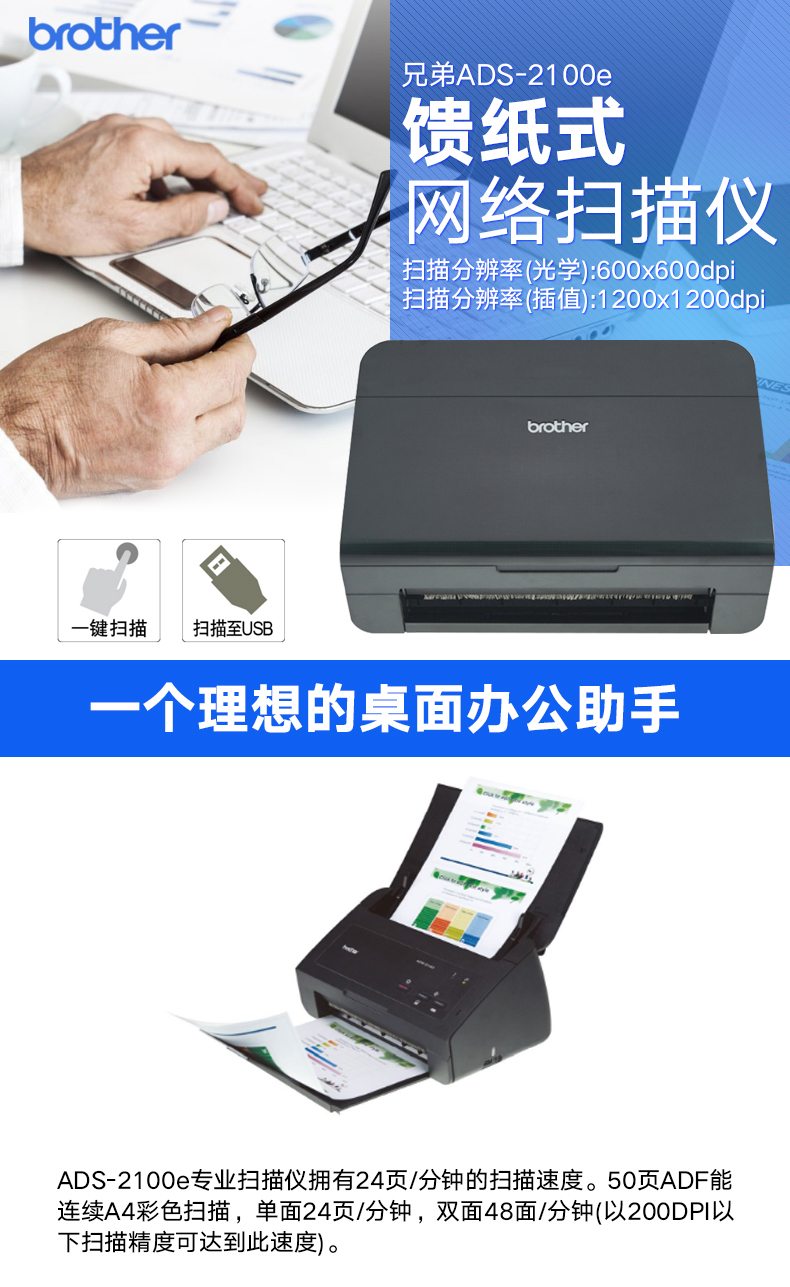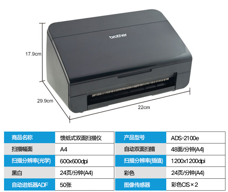 - 商品名称:兄弟(brother) ADS-2100e 馈纸式网络扫描仪自动双面批量连续高速办公扫描仪 兄弟ADS-2200