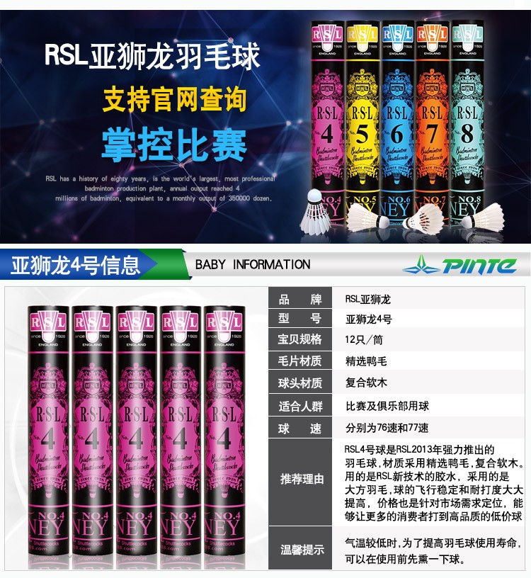 - 商品名称:亚狮龙(RSL) 亚狮龙RSL羽毛球4号5号6号7号鸭毛球飞行稳定落点准确耐打训练球 RSL10号一桶(12只装)