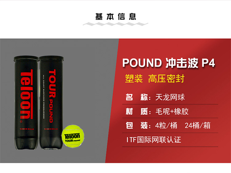 商品名称:Teloon天龙网球 有压罐装比赛训练网球POUND P3 P4高弹耐磨 P4 冲击波 两桶+球袋