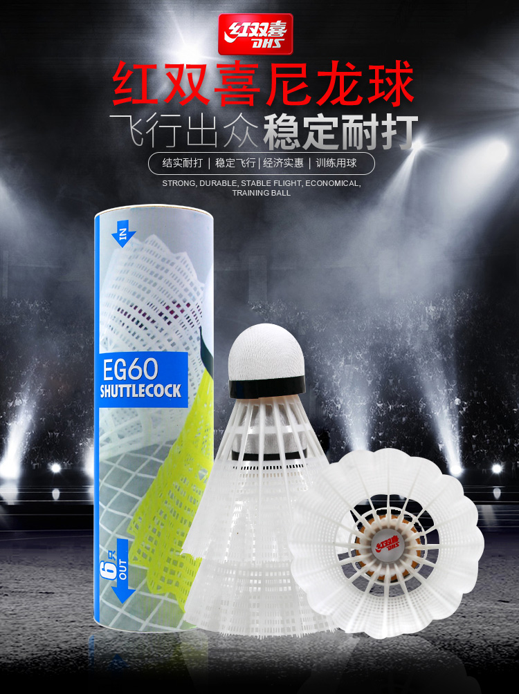 红双喜DHS耐打训练尼龙羽毛球塑料胶练习羽球6只装白色EG60