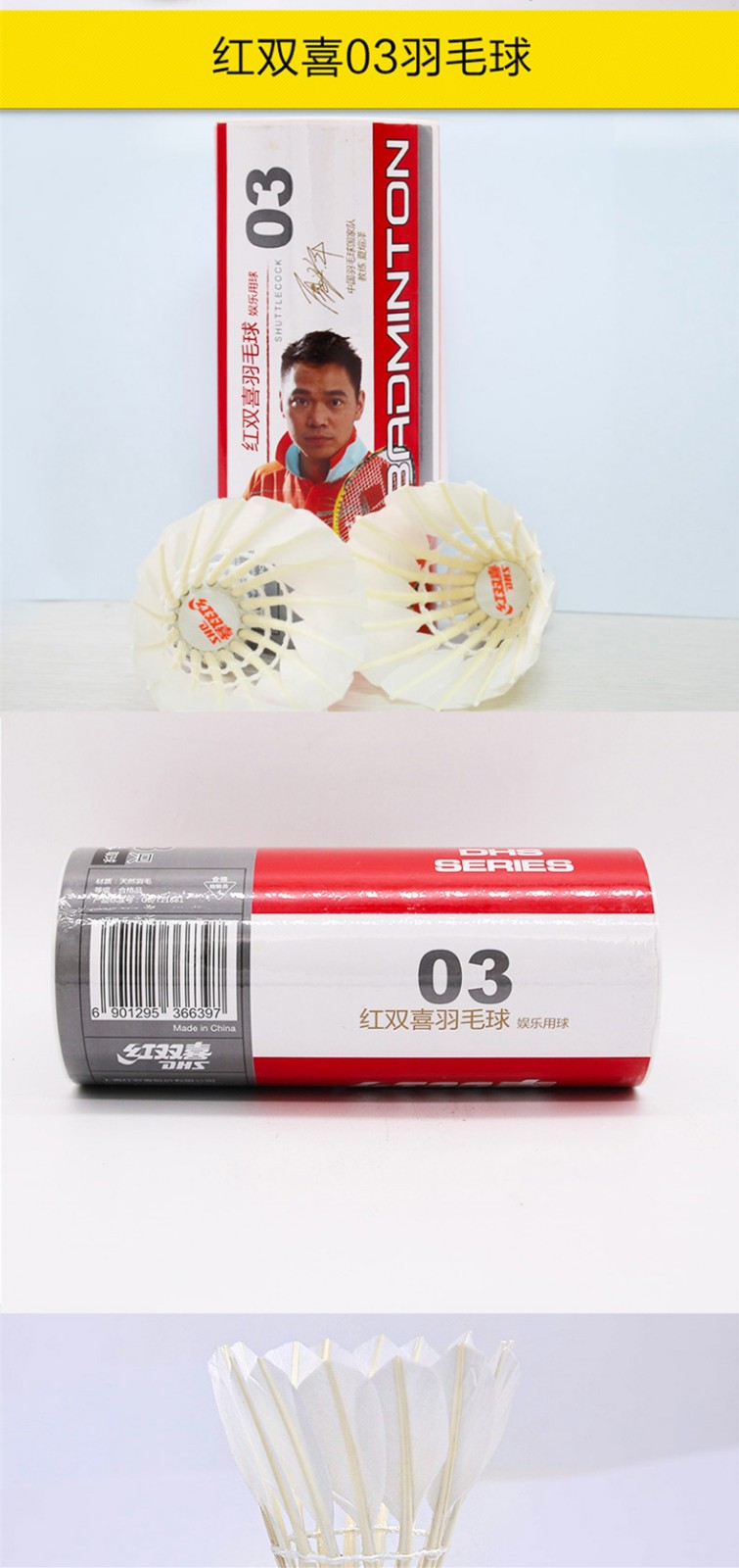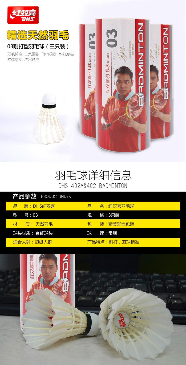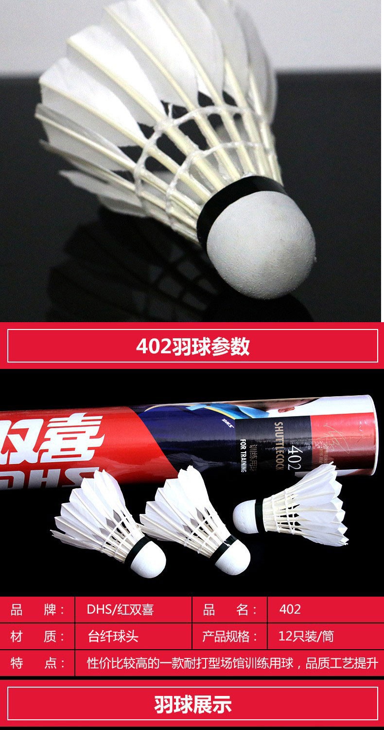 - 商品名称:红双喜羽毛球 正品耐打DHS娱乐/训练/比赛用球 稳定耐打 品质提升 402A羽毛球(6只装*1桶)