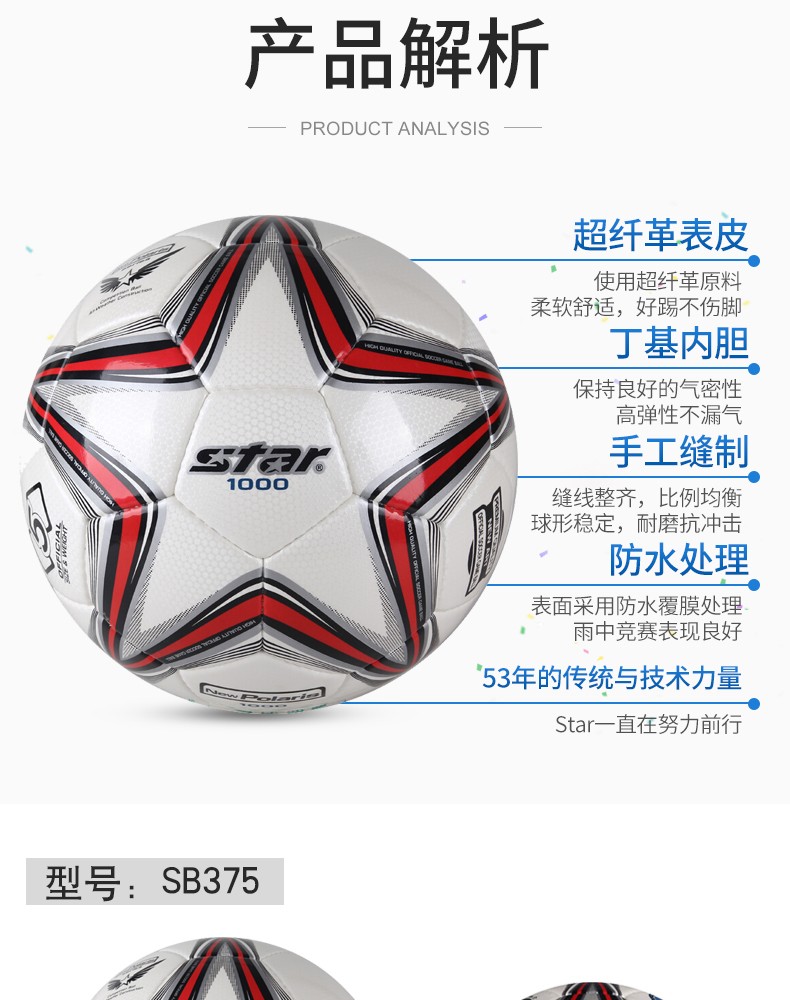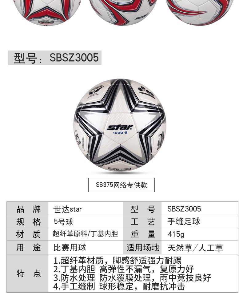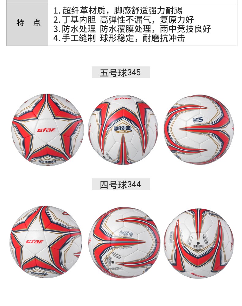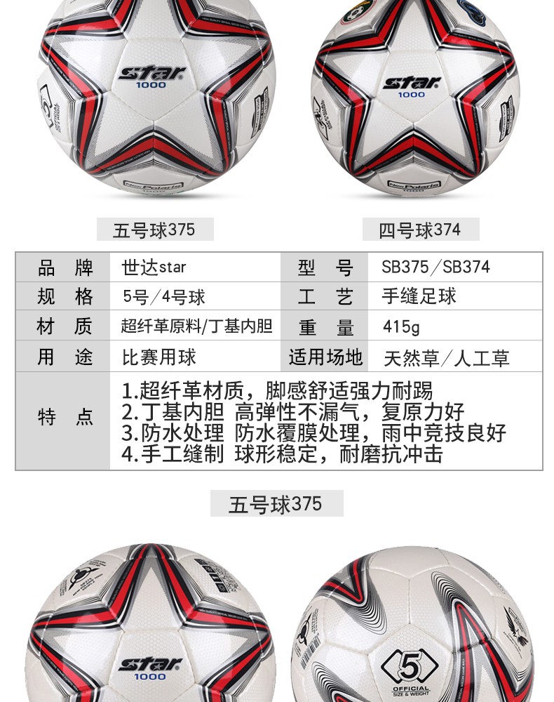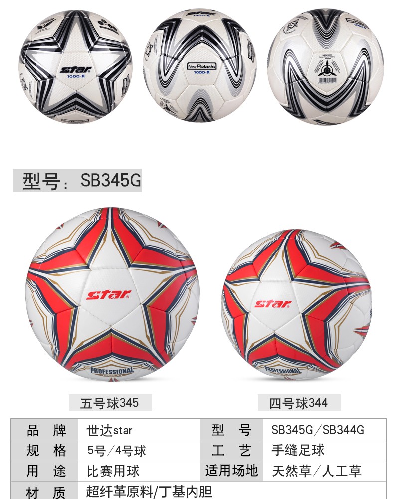 - 商品名称:世达(star)足球PU手缝比赛用球超纤革防水成人比赛5号球4号青少年小学生训练足球 SB375 5号(成人)