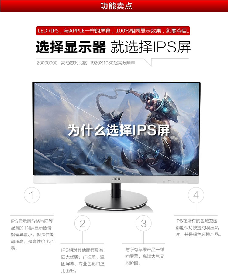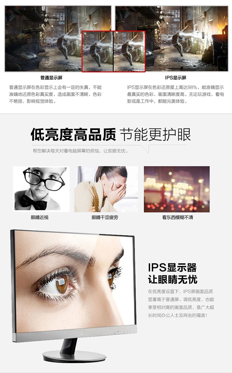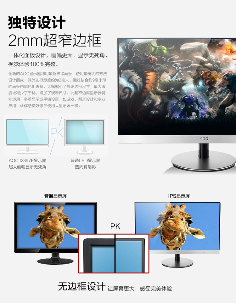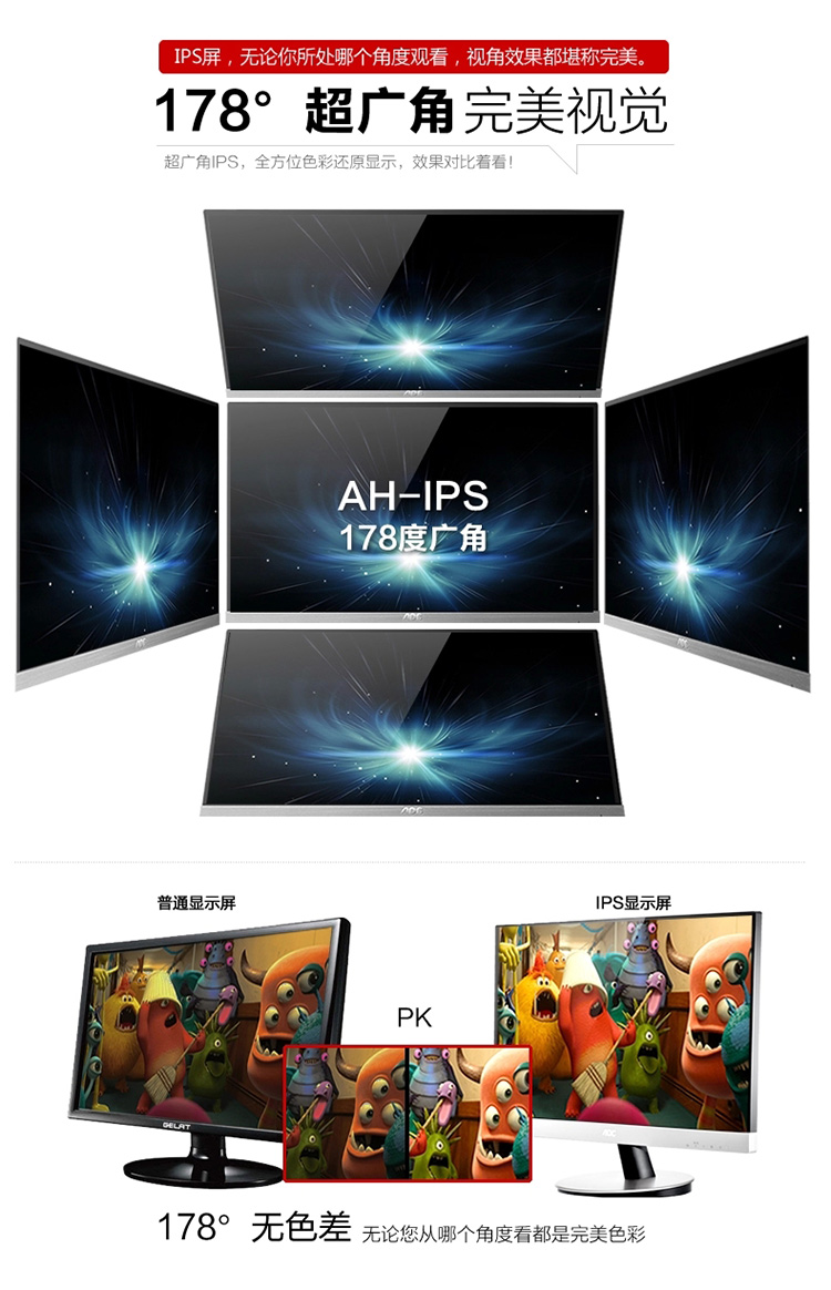 超窄边框LED显示器,边框仅2mm 采用新一代IPS广视角技术(AH-IPS) 画面更锐利,视角更广 Clear Vision 功能,使低分辨率的画面和文字更清晰,更锐利 LED背光灯技术打造绿色环保显示器 DCR丽比技术,对比度高达20,000,000:1 |