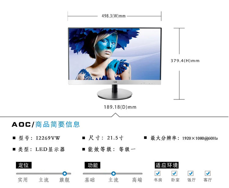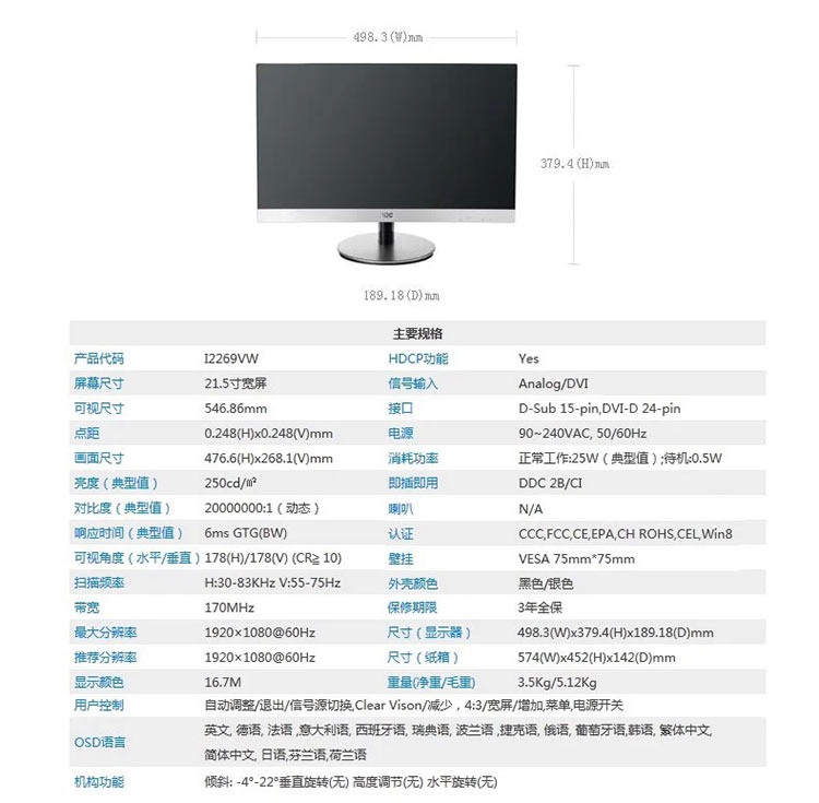 | 尺寸(显示器) | 498.3(W)x379.4(H)x189.18(D)mm |