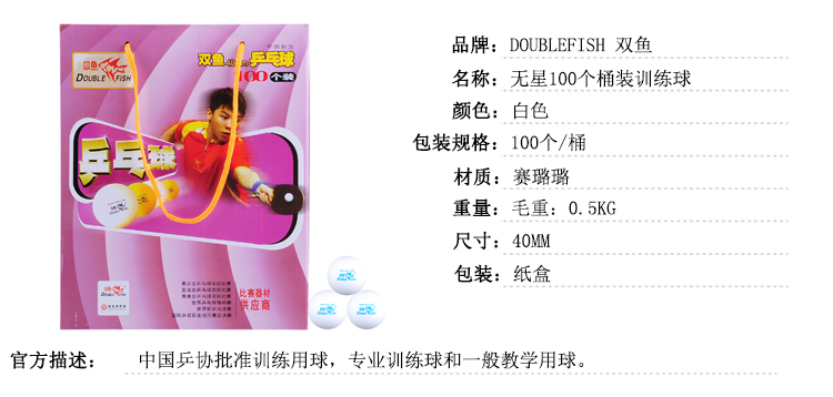 - 商品名称:双鱼 乒乓球无星 100个桶装兵乓球训练用球 白色