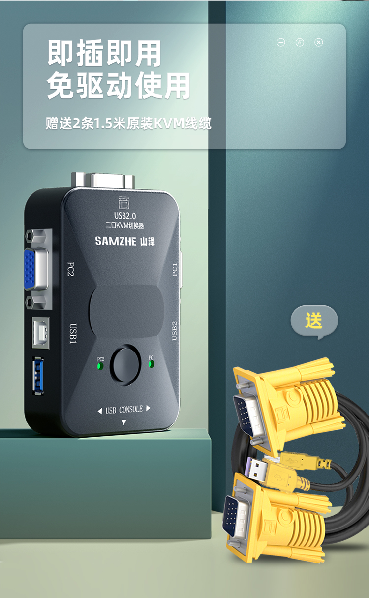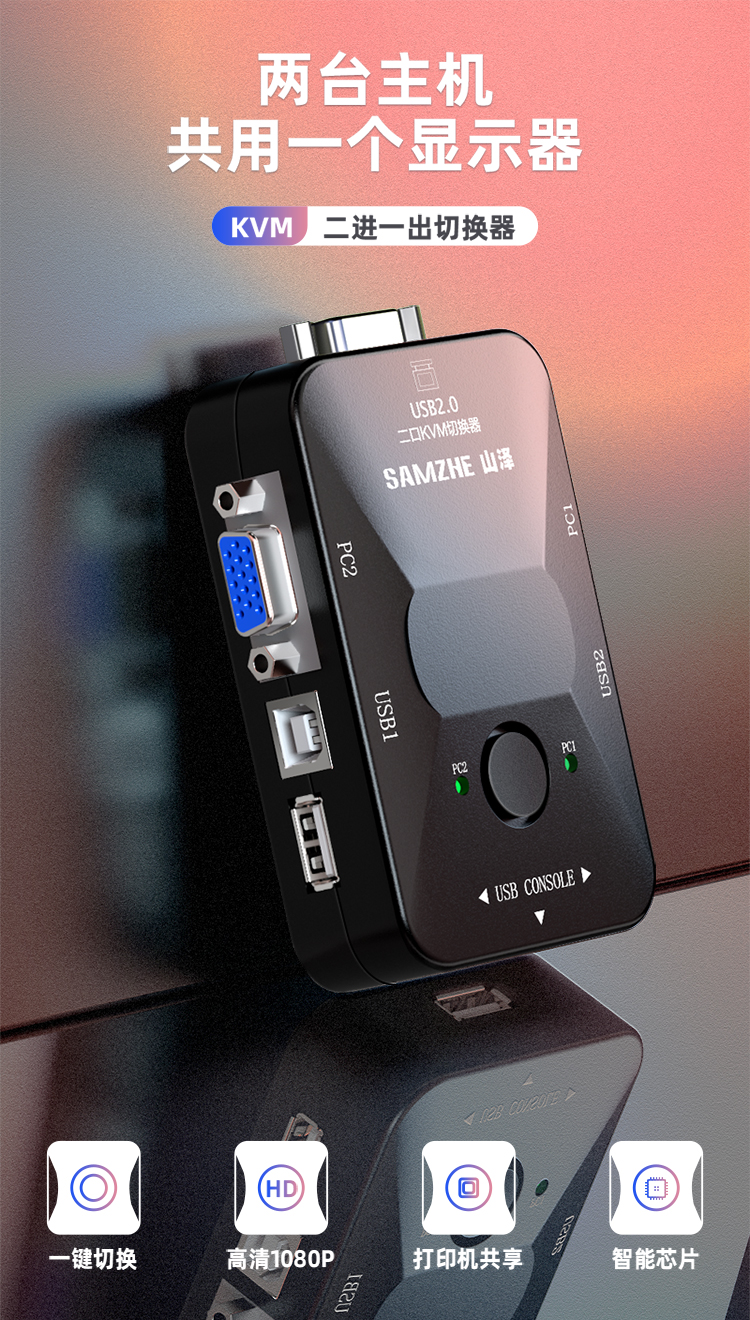 - 商品名称:山泽(SAMZHE)KVM切换器 VGA视频切屏器二进一出台式机电脑显示器USB2.0鼠标键盘打印机共享器 配线 SZ-211B