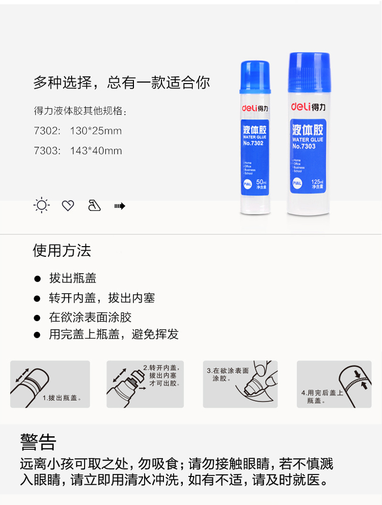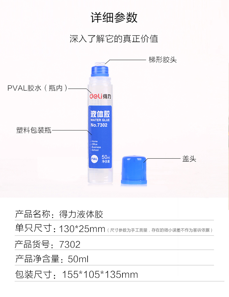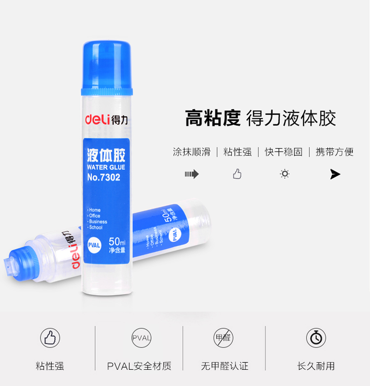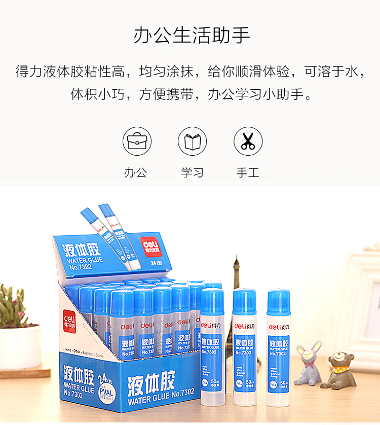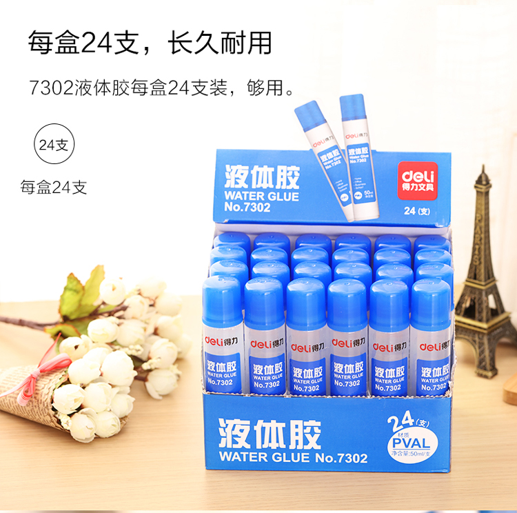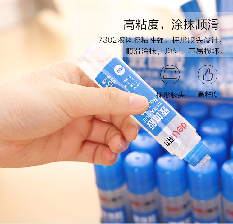 - 商品名称:得力(deli)50ml高粘度液体胶 学习办公通用胶水 24支装 办公用品 7302