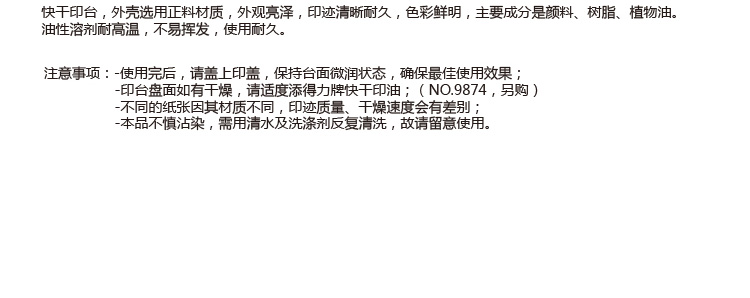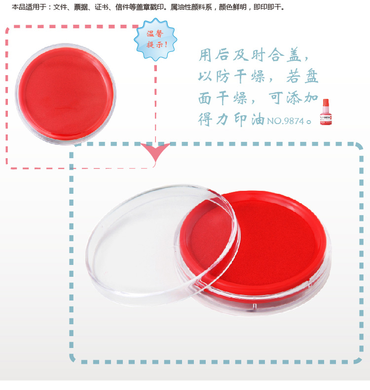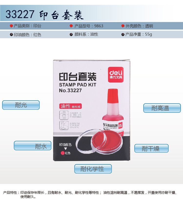 - 商品名称:得力(deli) 33227快干印台印油套装 (1*高效快干印油(红)+1*快干印台) 办公用品