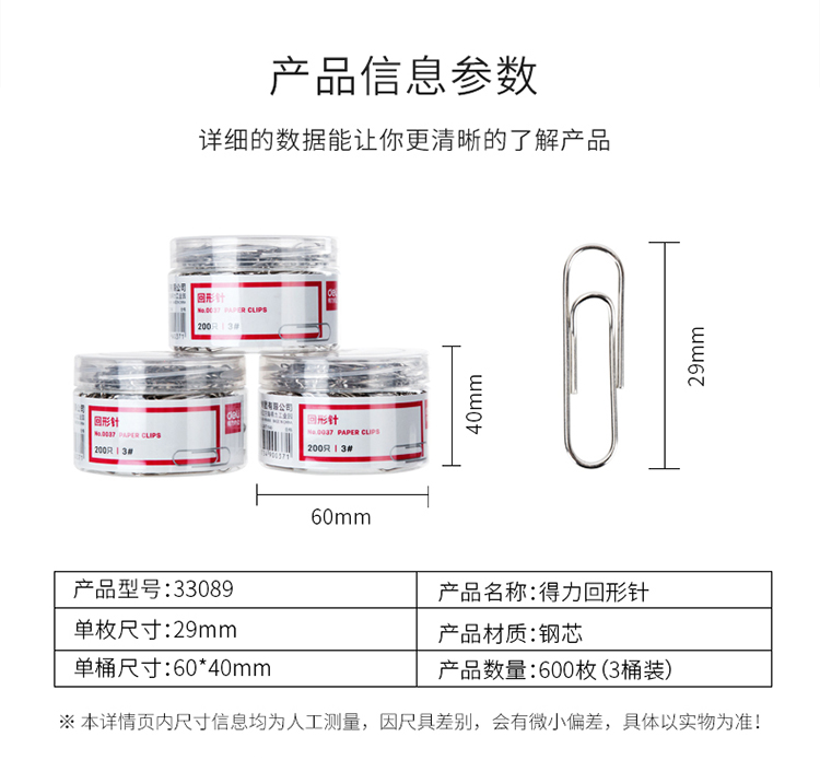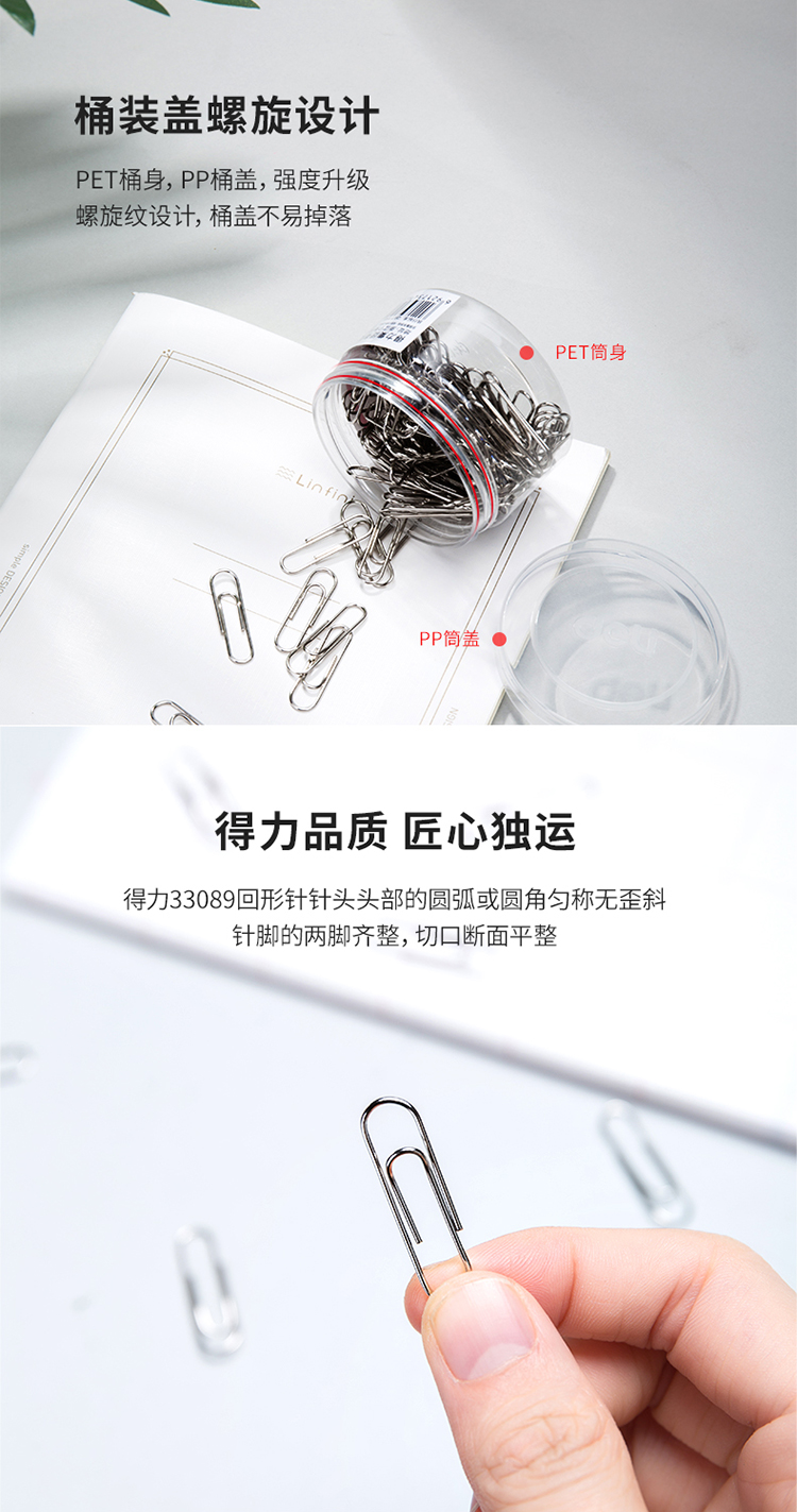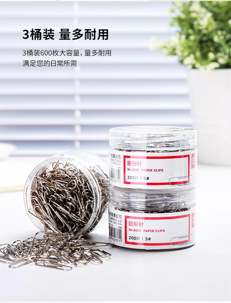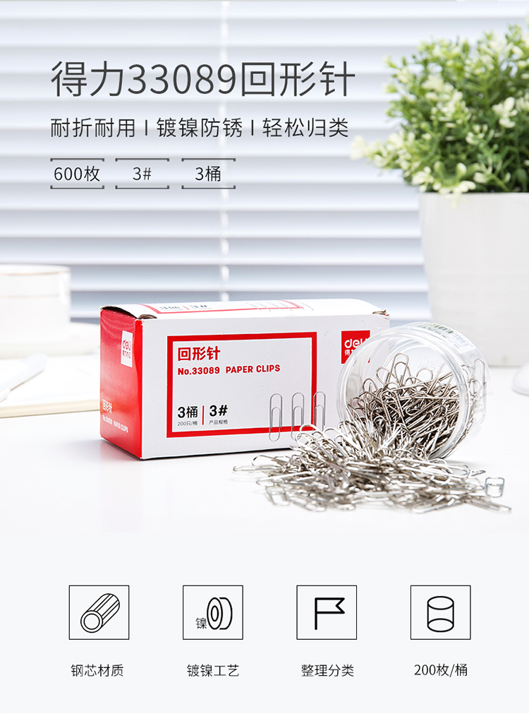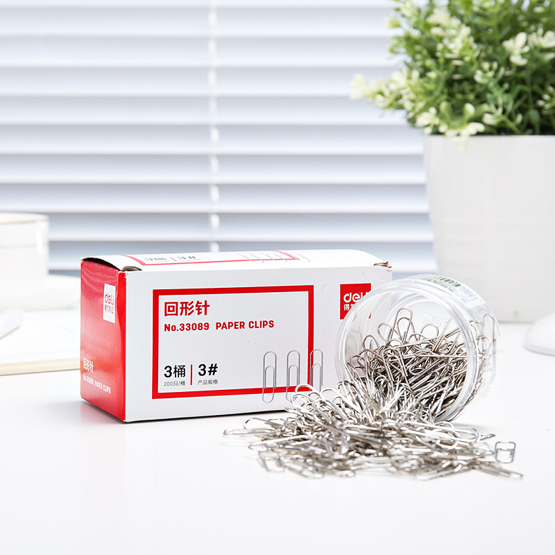 商品名称:得力(deli)29mm镀镍回形针 3#金属曲别针 200枚/筒 3筒装 办公用品 33089