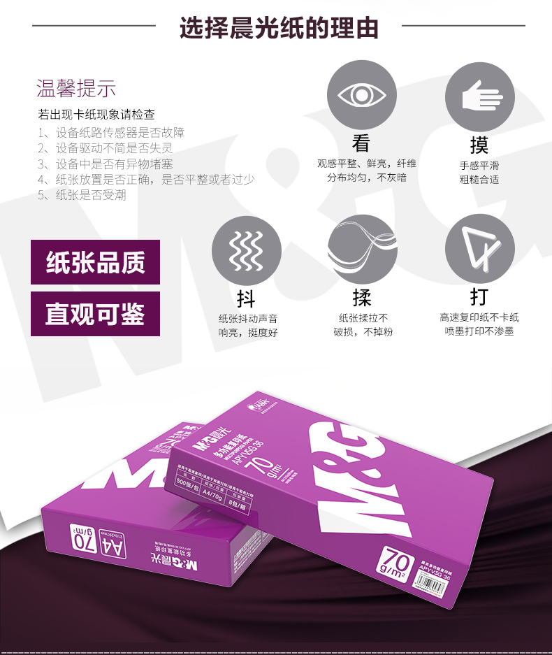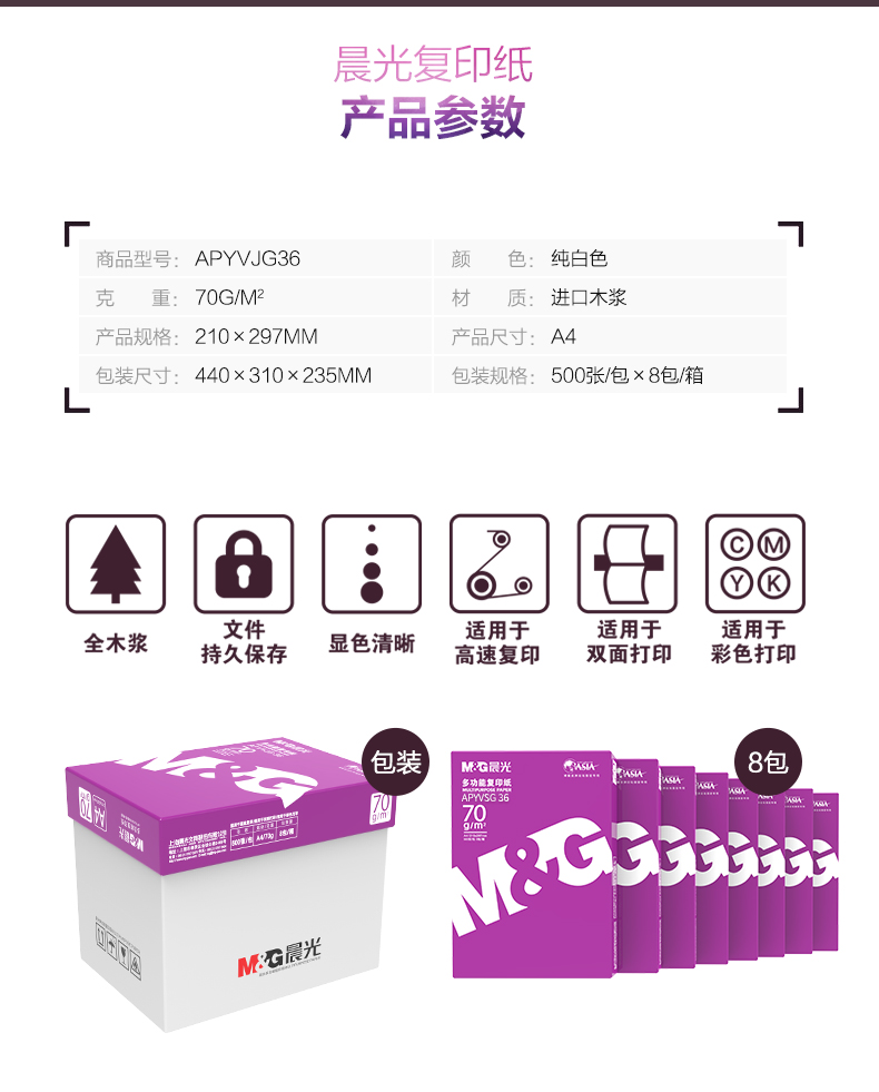 - 商品名称:晨光(M&G)紫晨光A4复印纸70g 500张/包 8包/箱(共4000张)APYVJG36
