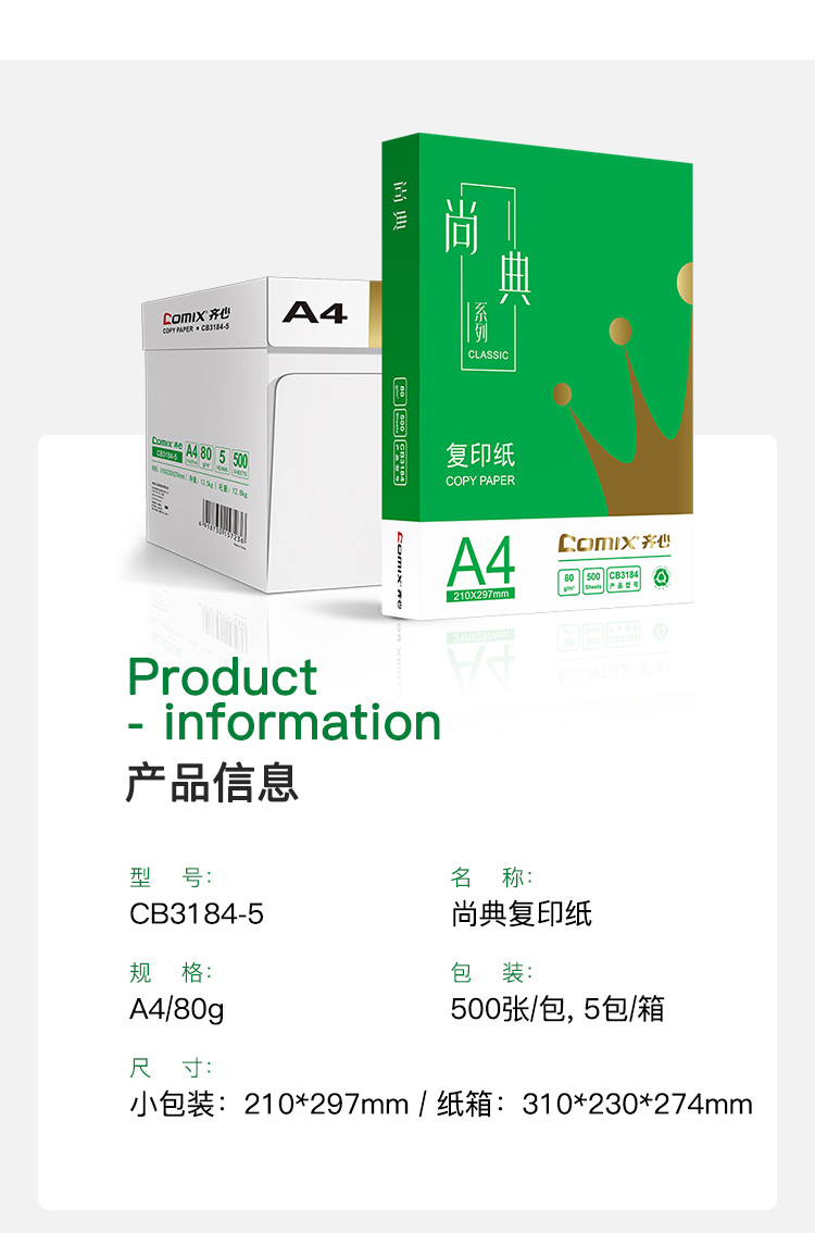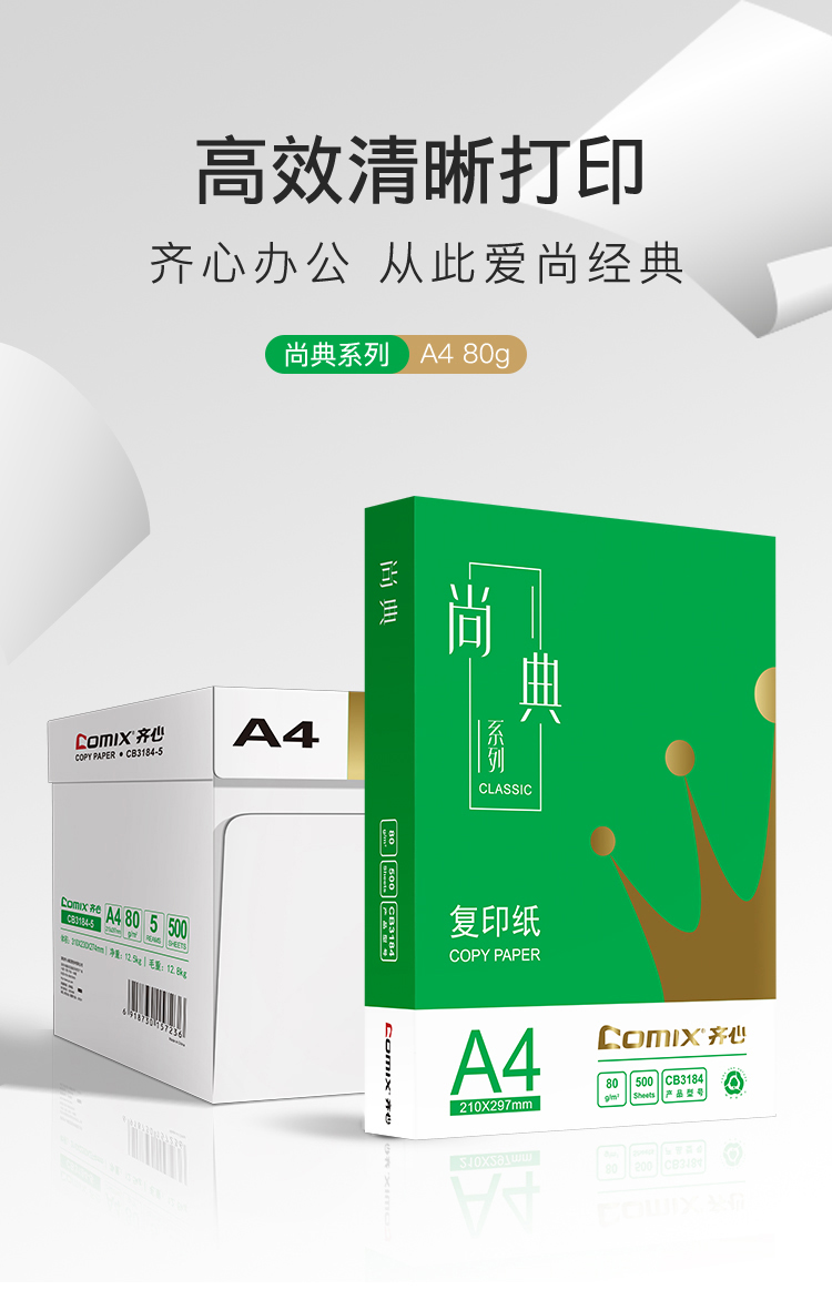 - 商品名称:齐心(Comix)尚典 80g A4 复印纸 500张/包 5包/箱(2500张) CB3184-5