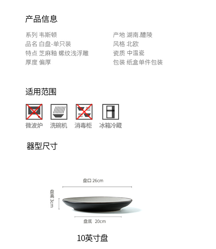 商品名称:亿嘉IJARL 日式家用陶瓷牛排盘西餐盘圆形水果盘平盘大菜盘西餐盘餐具 韦斯顿 10英寸白色单只装