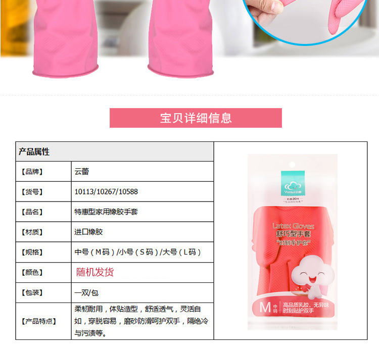 - 商品名称:云蕾 橡胶手套清洁耐用厨房洗碗洗衣家务手套 四季适用中号手套 10113