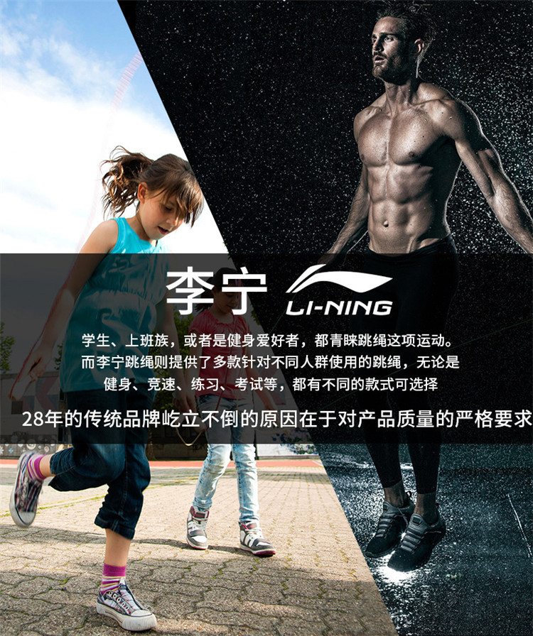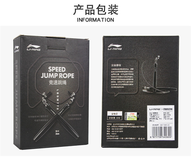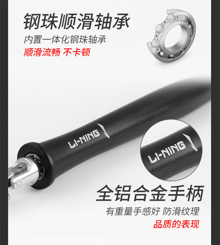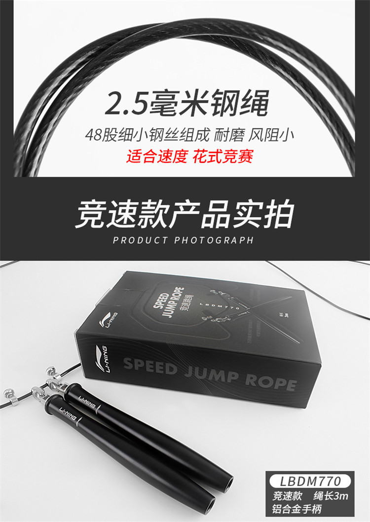 商品名称:李宁(LI-NING) 770黑色钢丝跳绳 铝合金手柄专业竞速跳绳钢丝带轴承可调节中考专用跳绳成人家用运动健身器材
