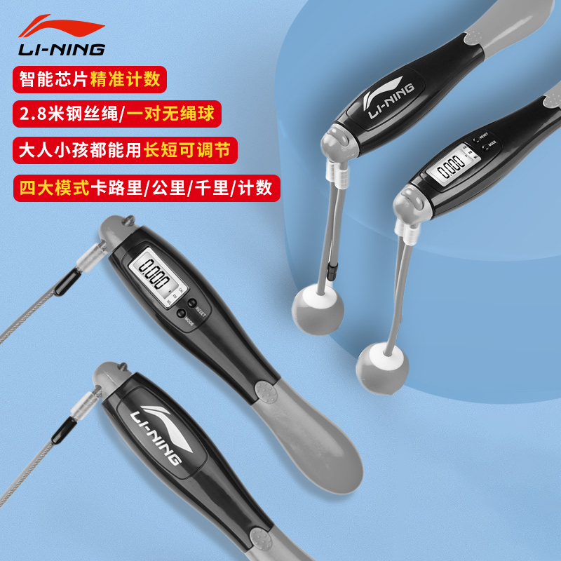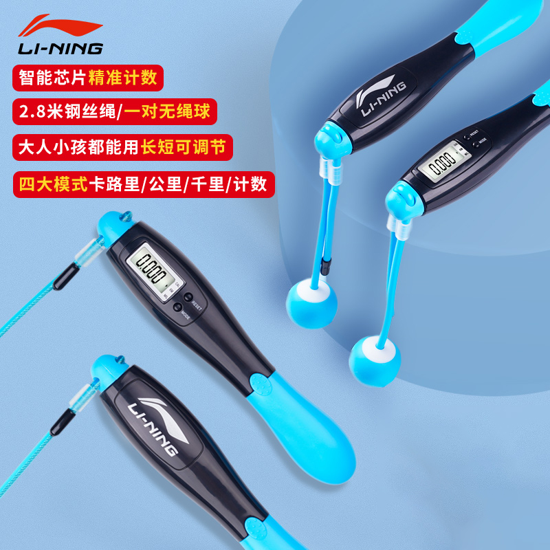 李宁(LI-NING)549蓝色跳绳计数无绳球无线男女小学生儿童成人钢丝绳家用体育健身器材