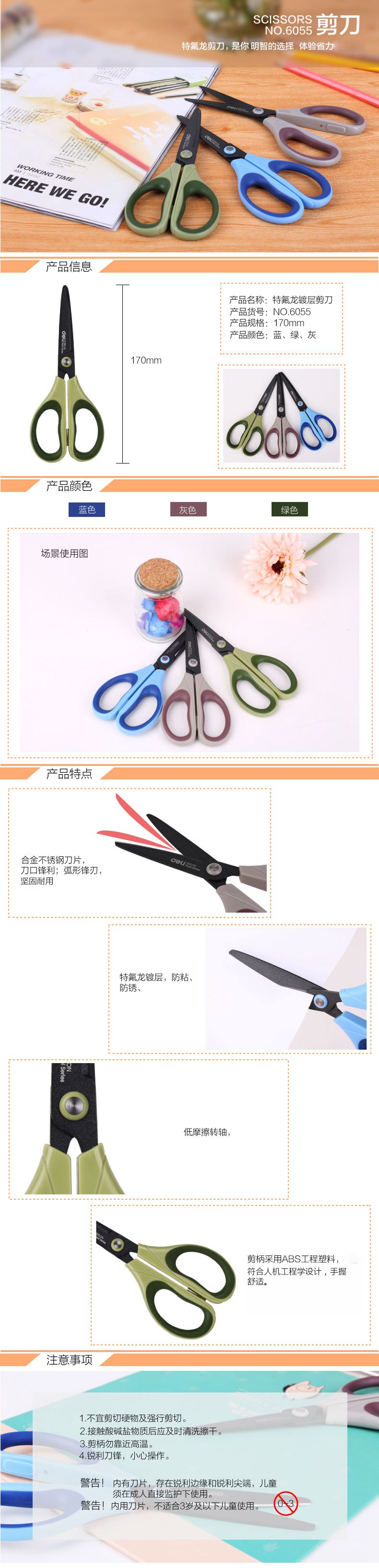 - 商品名称:得力(deli) 6055 特氟龙材质防粘不锈钢剪刀 170mm 颜色随机