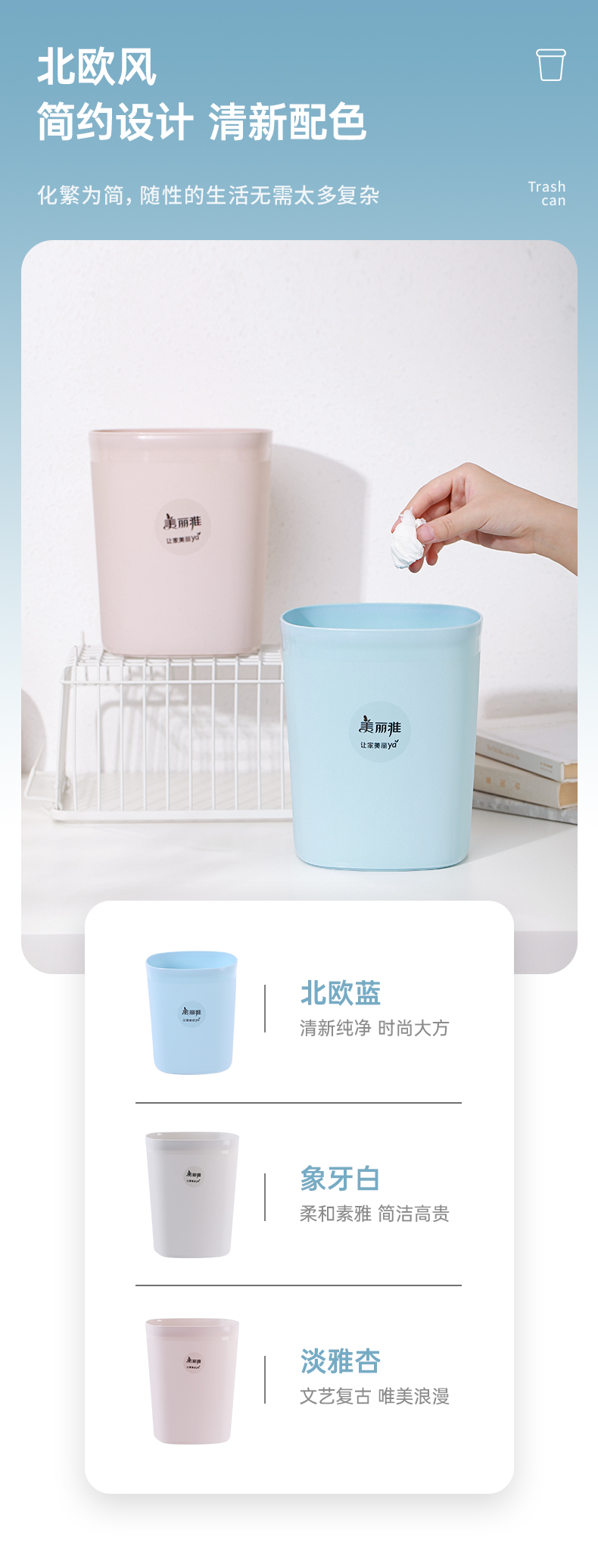 - 商品名称:美丽雅(MARYYA)垃圾桶炫彩圆形桶家用卫生间客厅厨房 大中小号桌面垃圾桶 白色(9L)