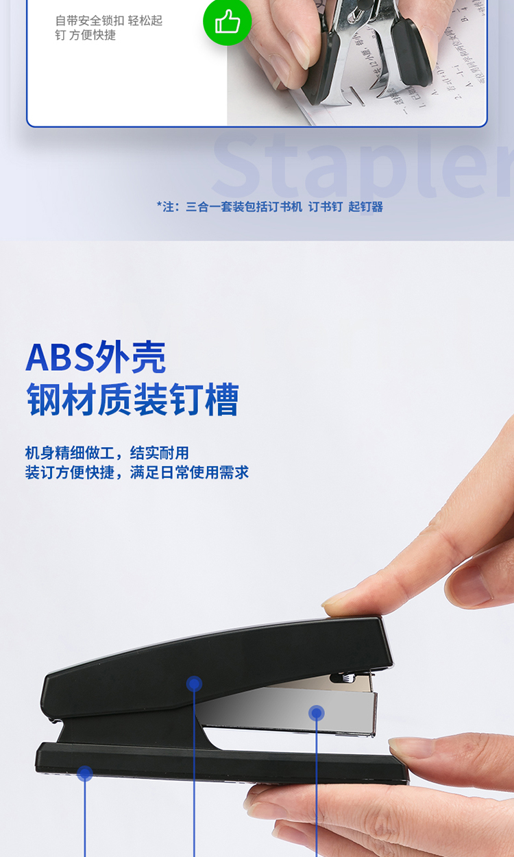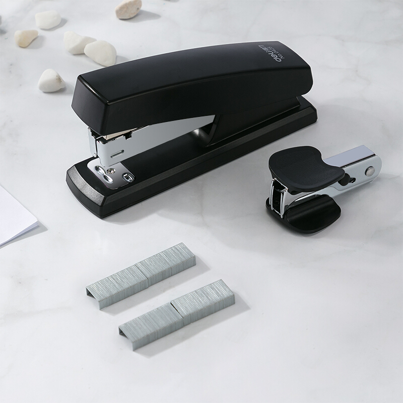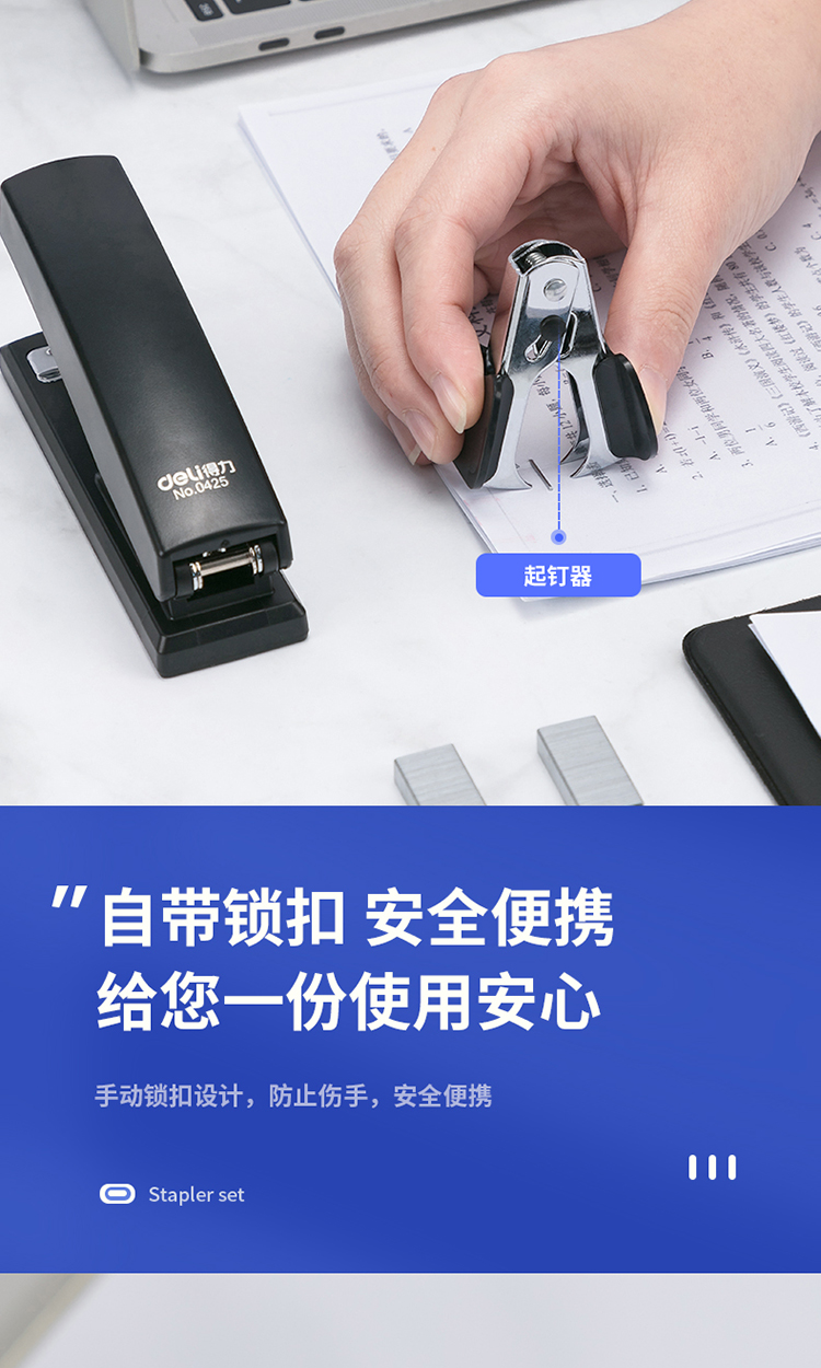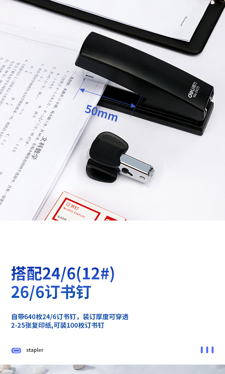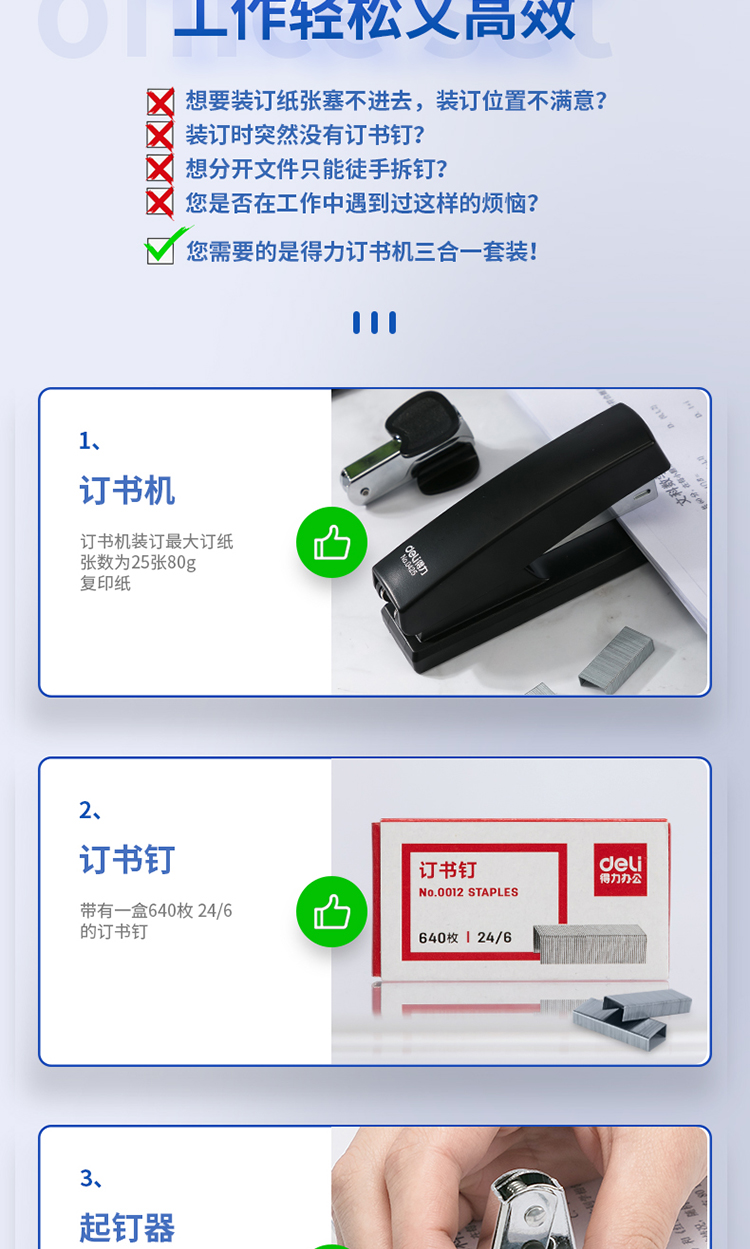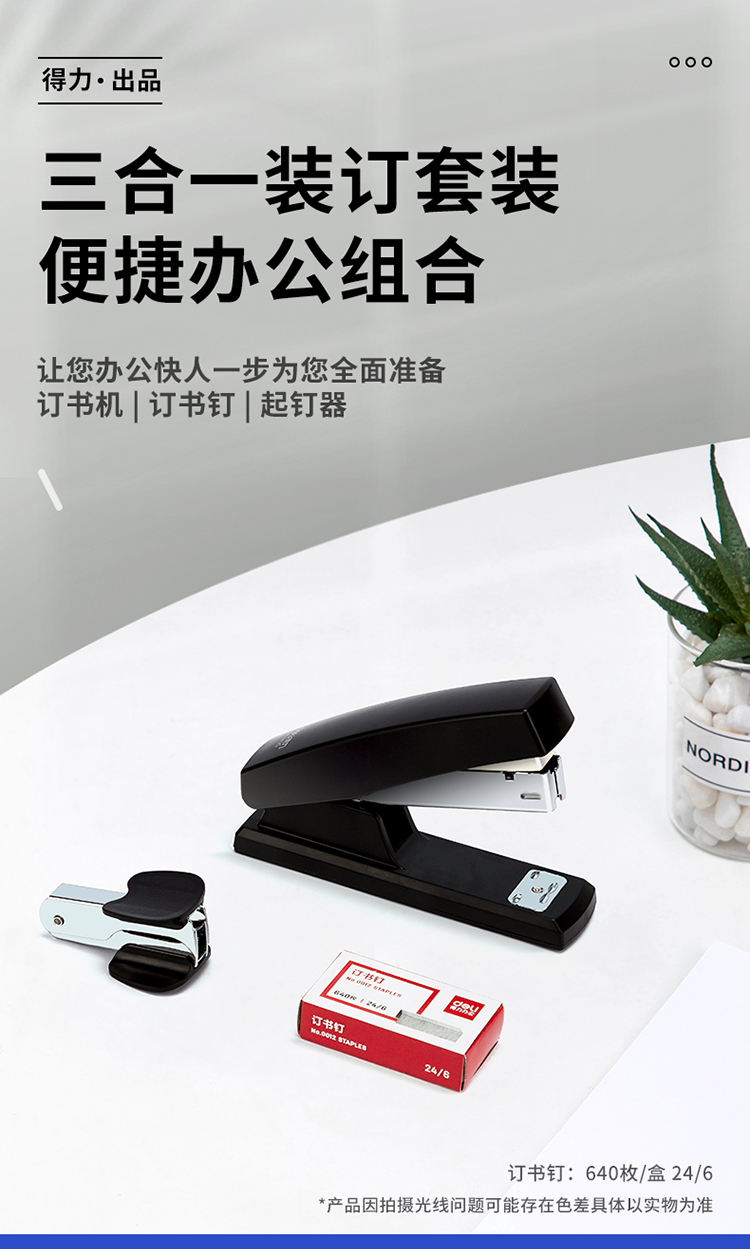 - 商品名称:得力(deli)12#办公订书机3件套(订书器+订书钉+起钉器) 办公用品 黑色0354