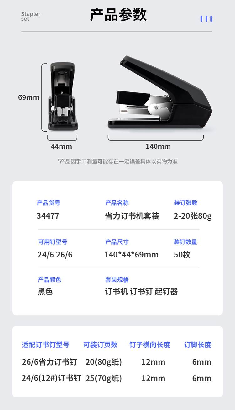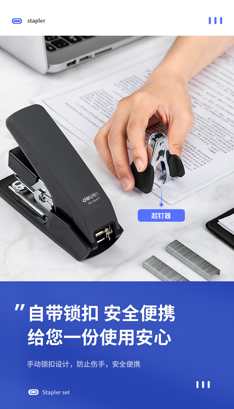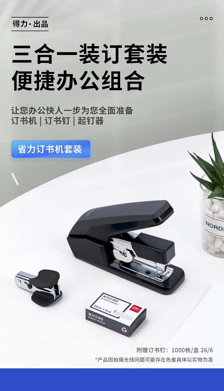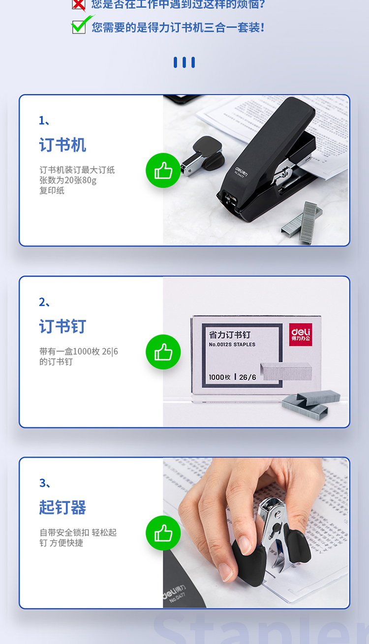 - 商品名称:得力(deli)省力订书机组合套装(订书器+起钉器+订书钉) 适配12#钉 办公用品 34477