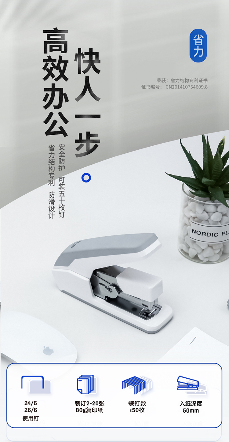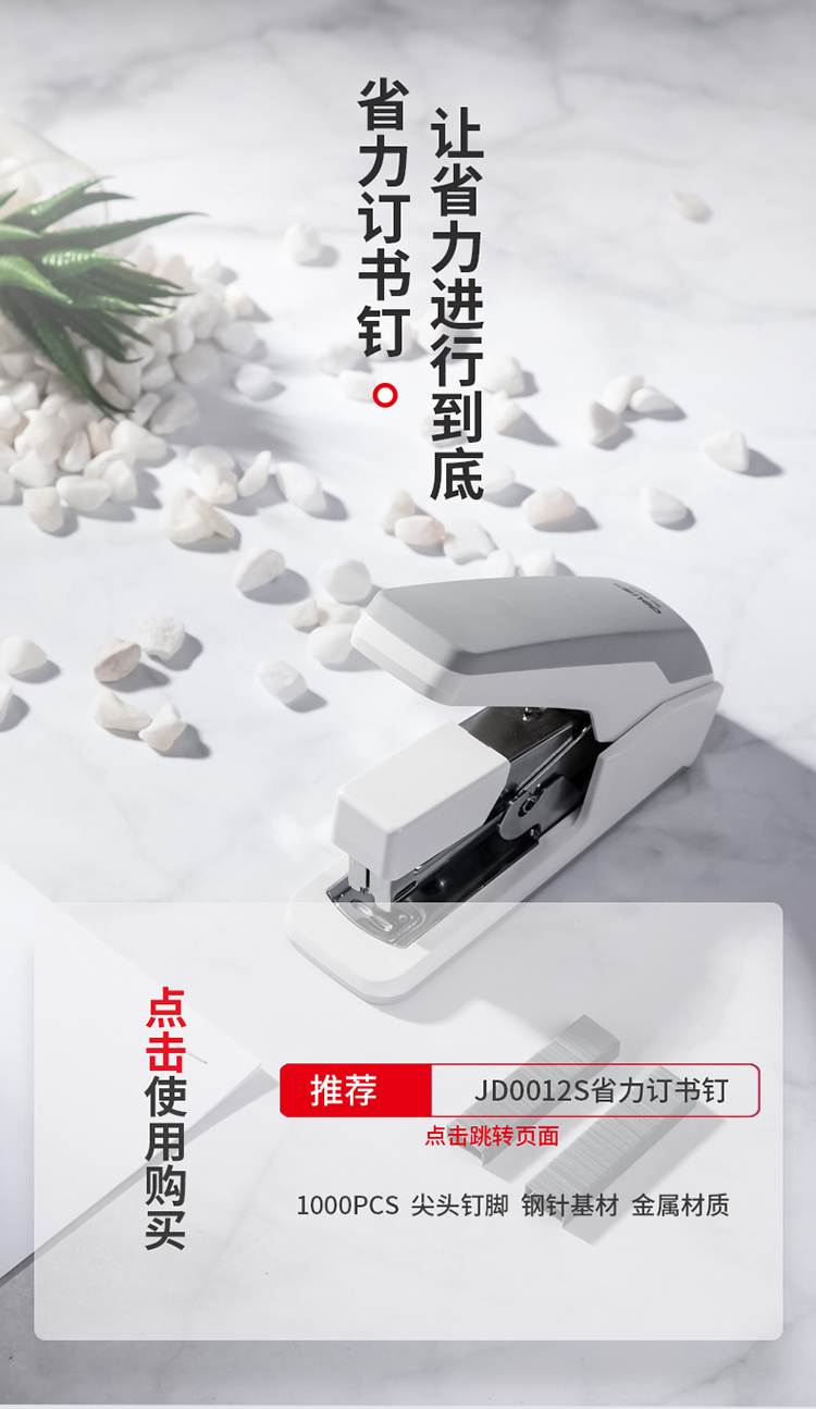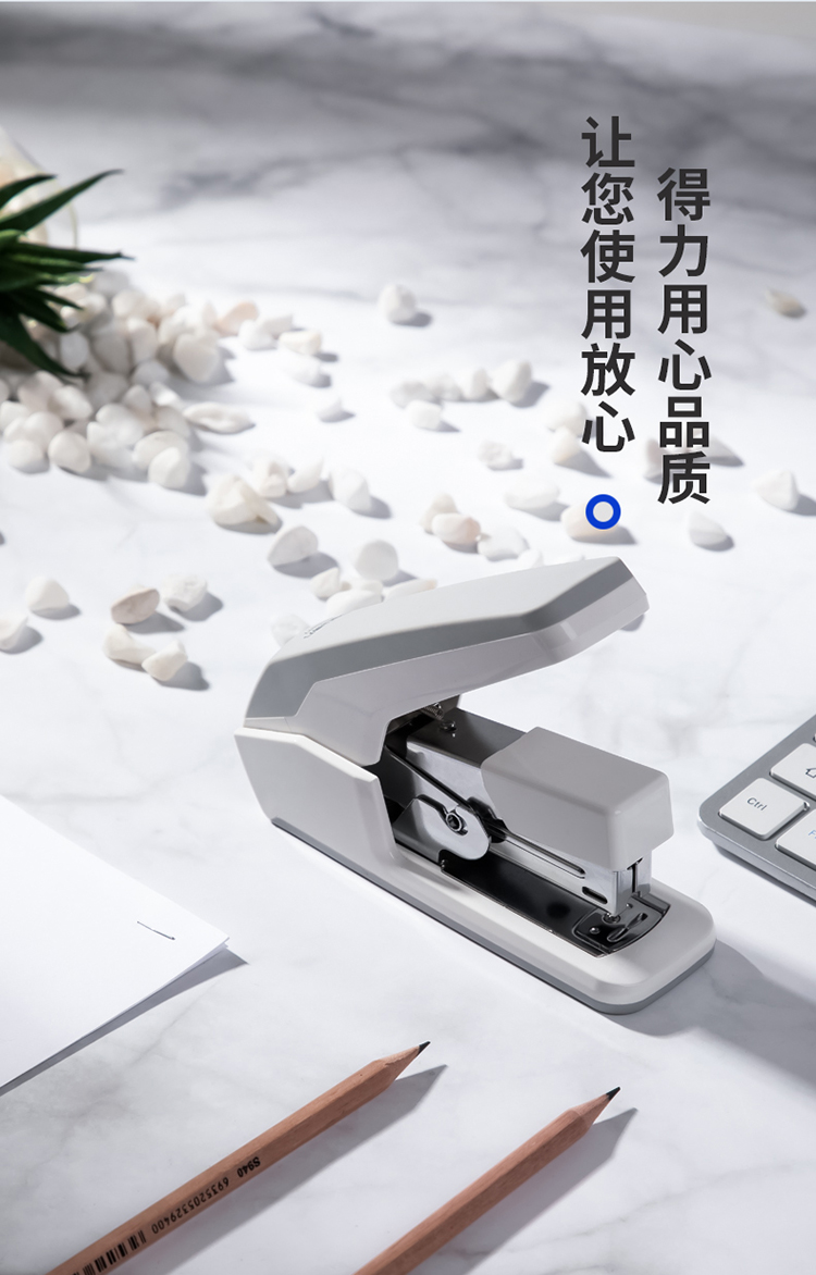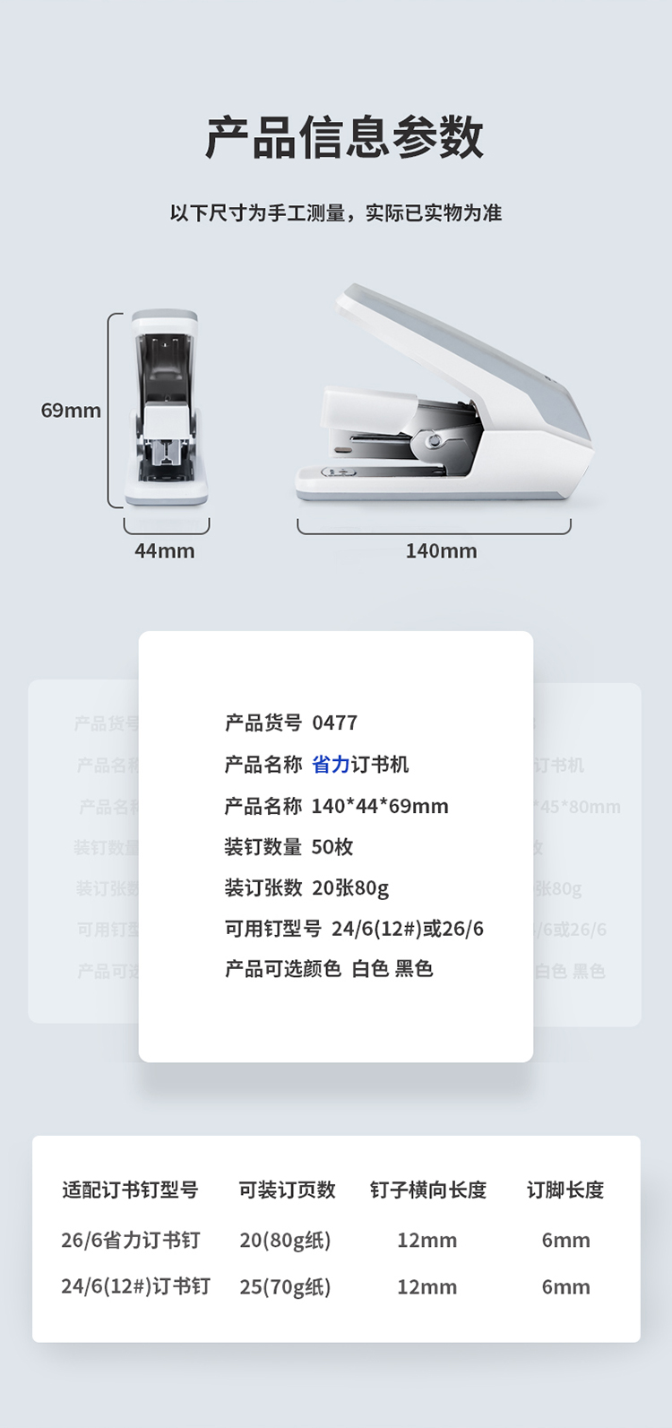 - 商品名称:得力(deli)省力结构订书机/装订器 一指按压 适配12#钉 白色0477