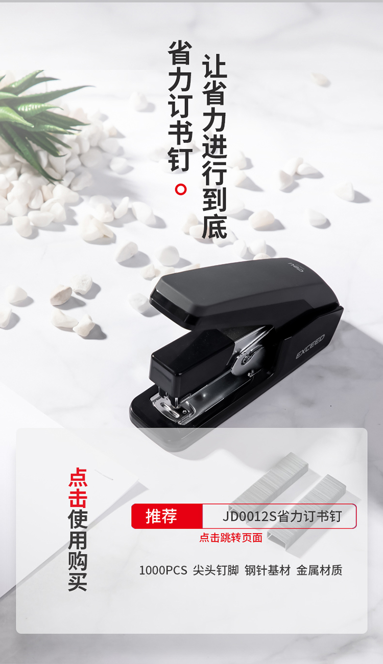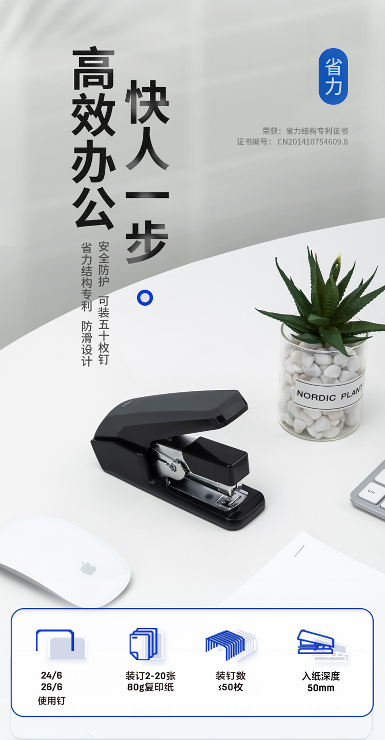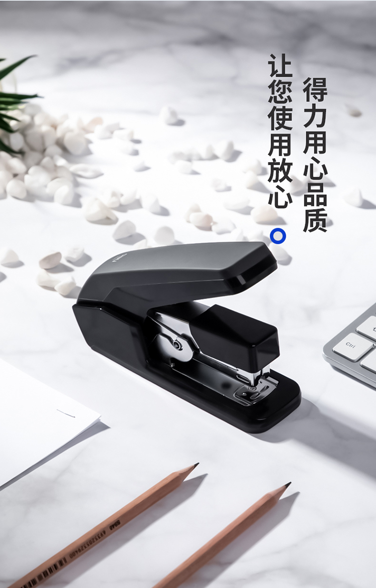 - 商品名称:得力(deli)省力结构订书机/装订器 一指按压 适配12#钉 黑色0477