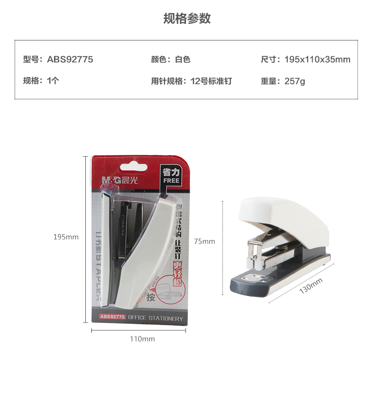 - 商品名称:晨光(M&G)文具12#白色省力型弹出式订书机 商务办公订书器 办公用品 单个装ABS92775