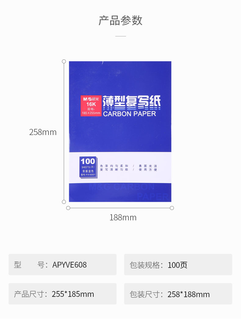 - 商品名称:晨光(M&G)文具双面16K/100页蓝色薄型复写纸 188*258mm办公复写纸 单本装APYVE608