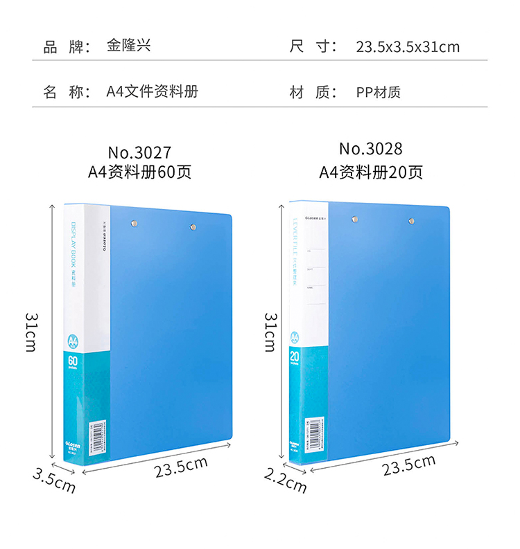- 商品名称:金隆兴(Glosen)资料册80页资料文件册(带盒)A4文件插页袋分类册 3032