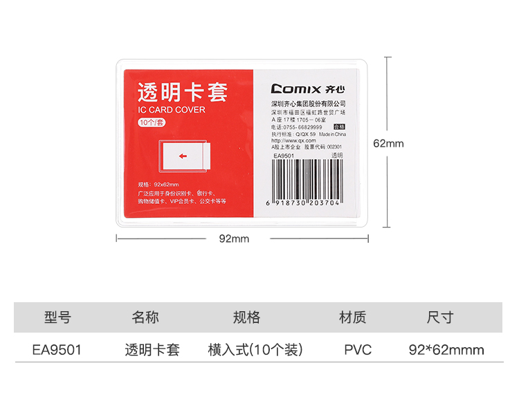 - 商品名称:齐心(Comix)10个装防水透明PVC横入式证件卡套 公交IC卡套保护套EA9501