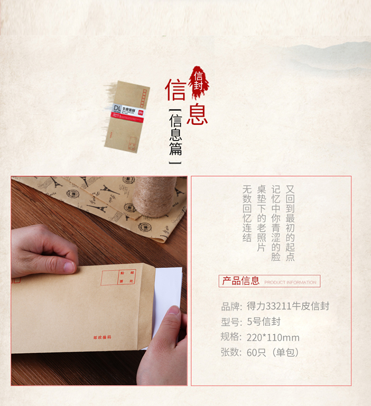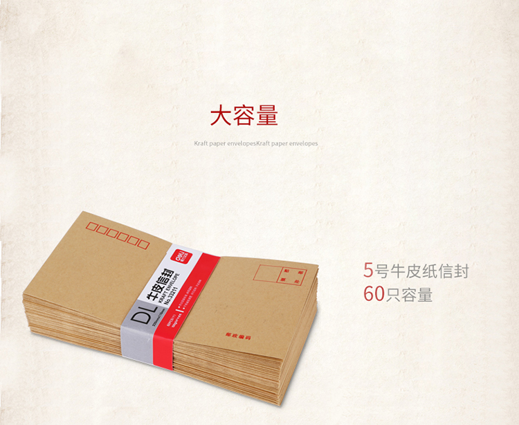 商品名称:得力(deli)60张5号牛皮纸信封 邮局标准信封220*110mm33211