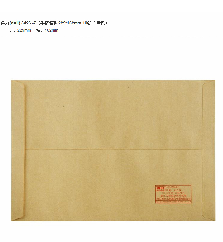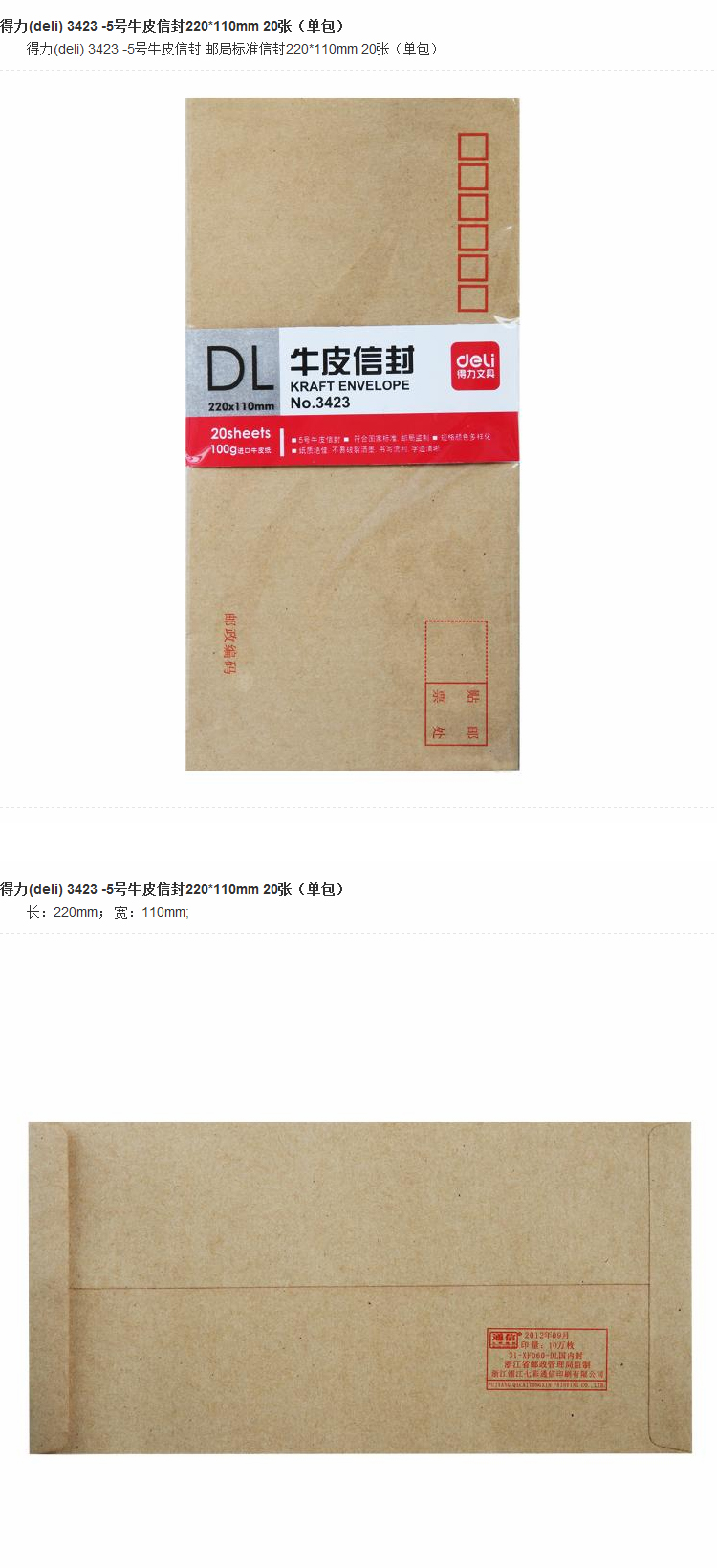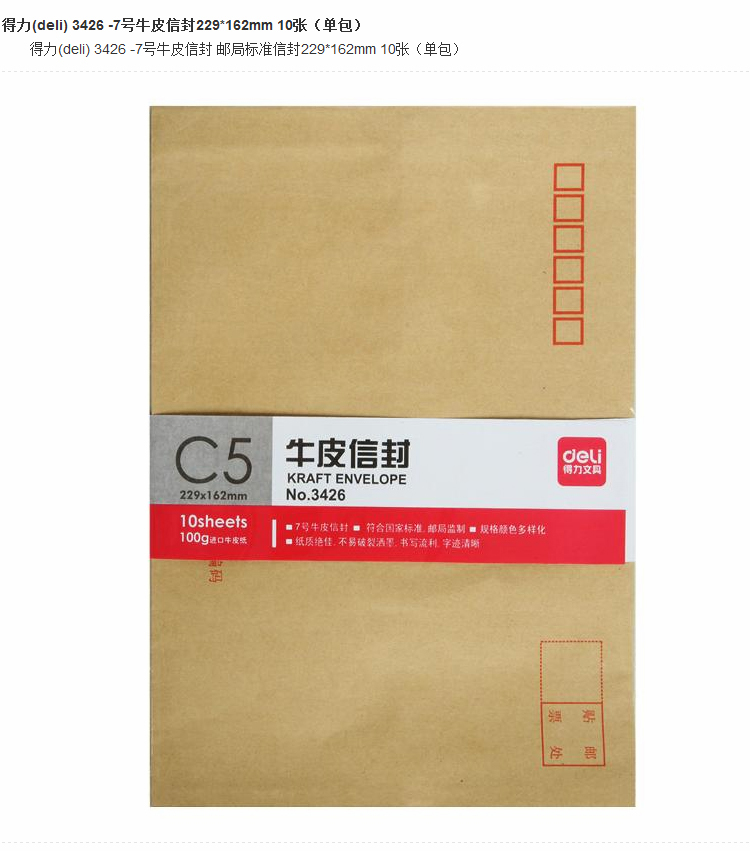 - 商品名称:得力(deli)3号/5号/7号/9号 白纸信封/牛皮纸黄色信封邮局标准信封 办公用品 牛皮纸信封 9号 324*229mm(40个装)
