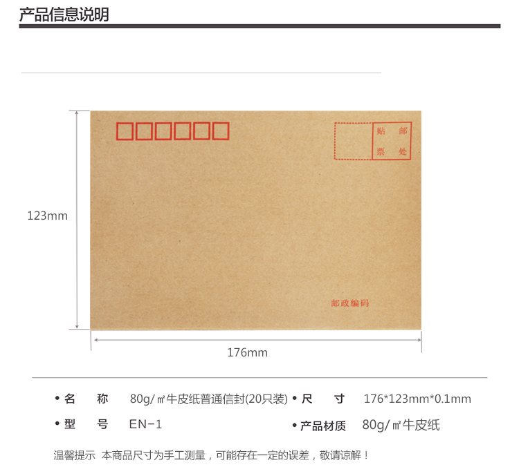 - 商品名称:广博(GuangBo)80g牛皮纸信封3号B6邮局标准123*176mm 100只装 EN-1