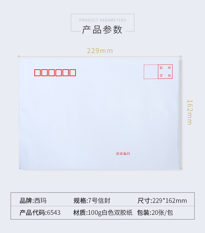 - 商品名称:西玛(SIMAA)20张7号白色信封 邮局标准信封229*162mm6543