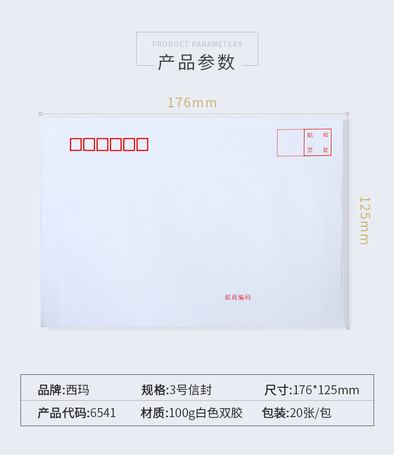 - 商品名称:西玛(SIMAA)20张3号白色信封 邮局标准信封176*125mm 6541
