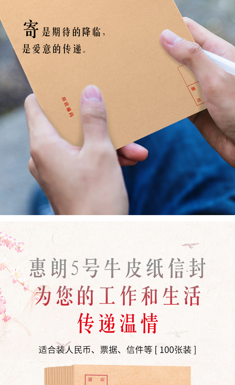- 商品名称:惠朗(huilang)100张文具5号牛皮纸信封 220*110mm 100g加厚木浆牛皮纸邮局标准信封工资袋0689