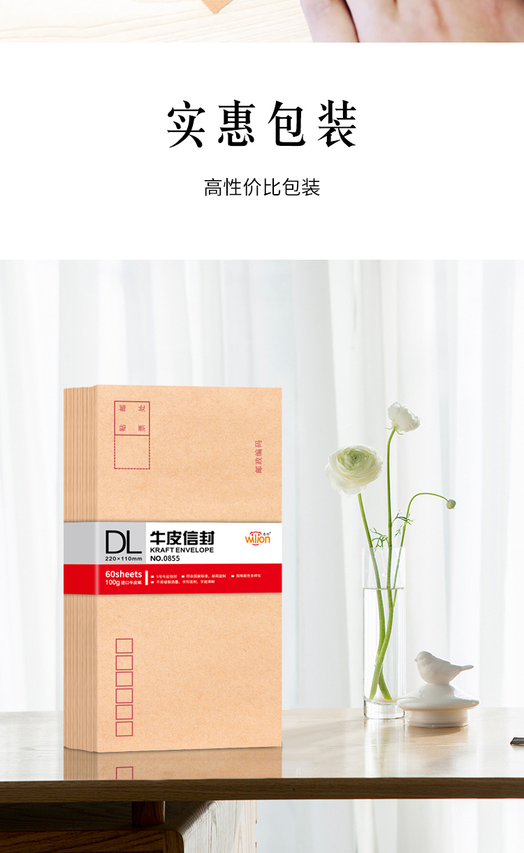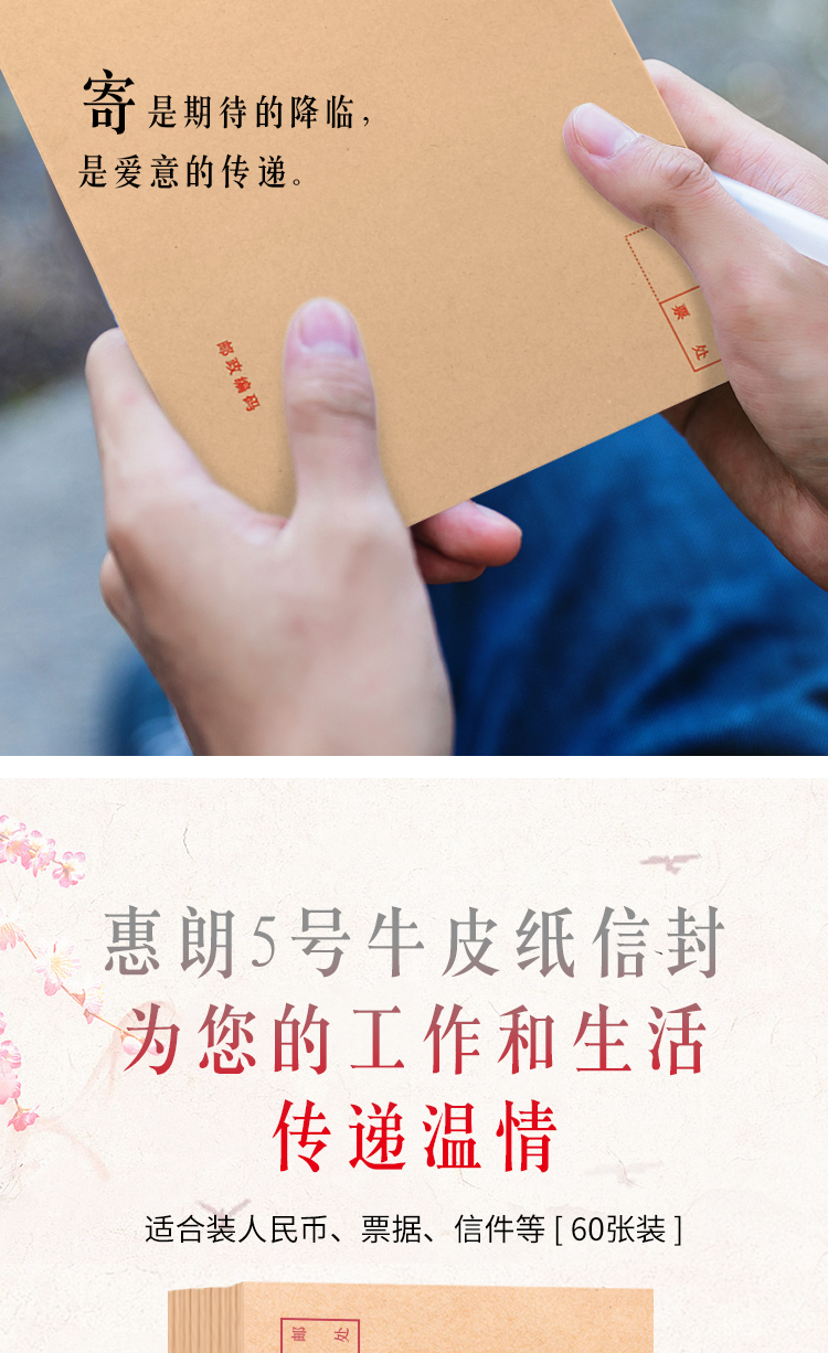 - 商品名称:惠朗(huilang)60张文具5号牛皮纸信封220*110mm 100g加厚木浆邮局标准信封工资袋0855