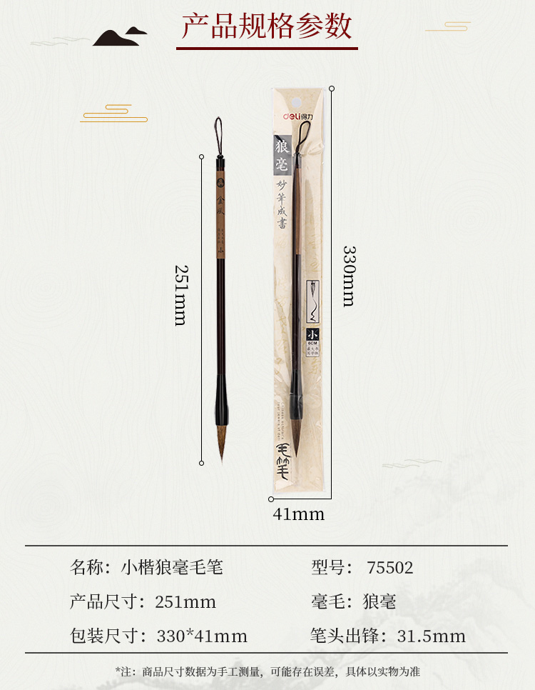 - 商品名称:得力(deli)小号狼毫毛笔 书法国画大中小楷成人初学者笔 行草隶篆书笔文房四宝 75502